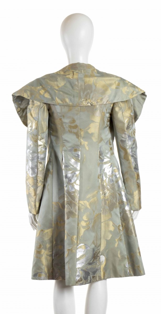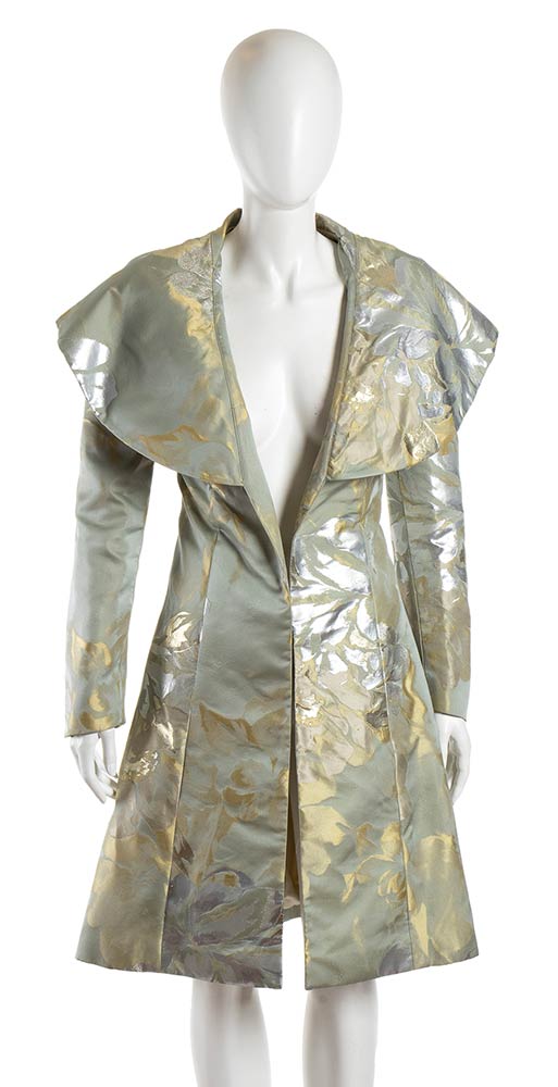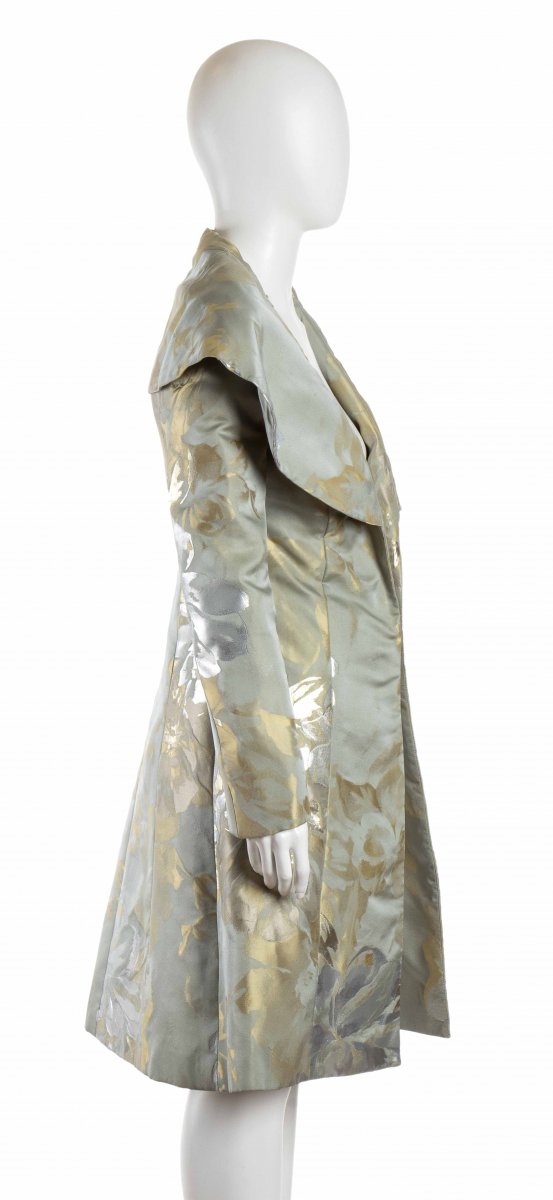 Soprabito in raso celeste lavorazione jacquard argento e oro, collo a stola, Vita 70 cm