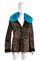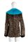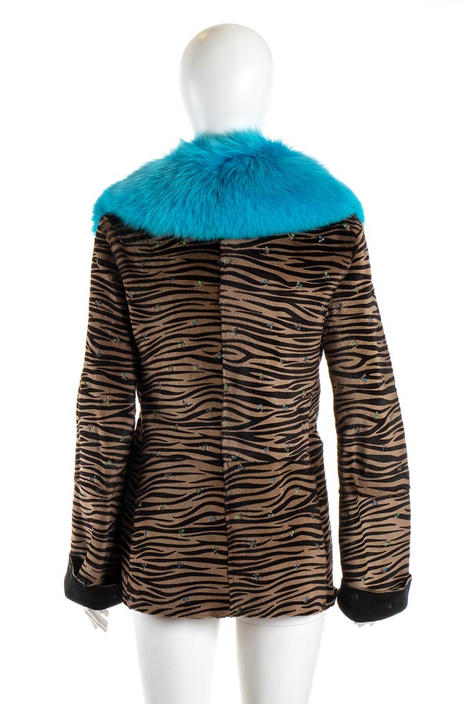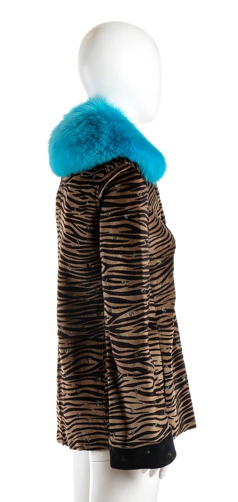 Giacca in cavallino stampato e ricamato, collo turchese in pelliccia di volpe