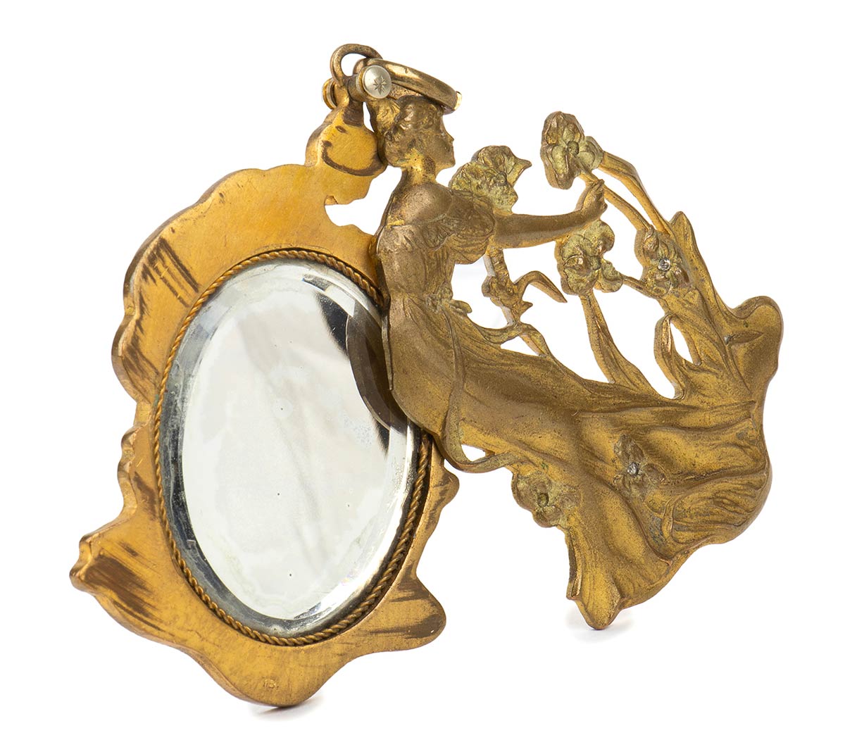 Specchietto a pendente Art Nouveau in ottone, coperchio scorrevole con immagine femminile, 3 piccoli brillanti, specchio molato