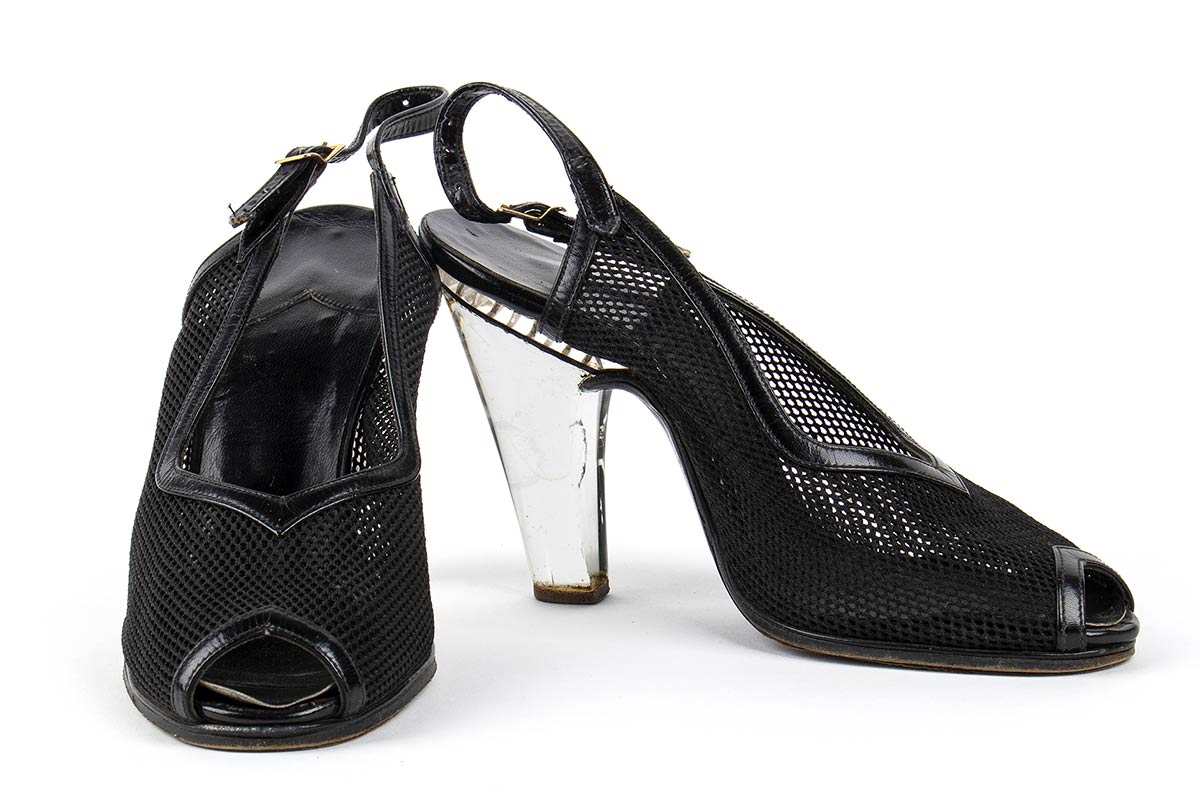 Sandalo in pelle e tessuto a rete nero, tacco in lucite