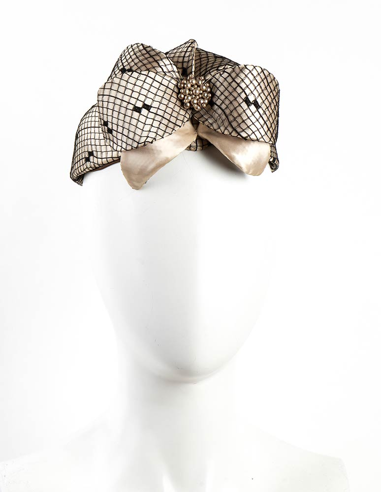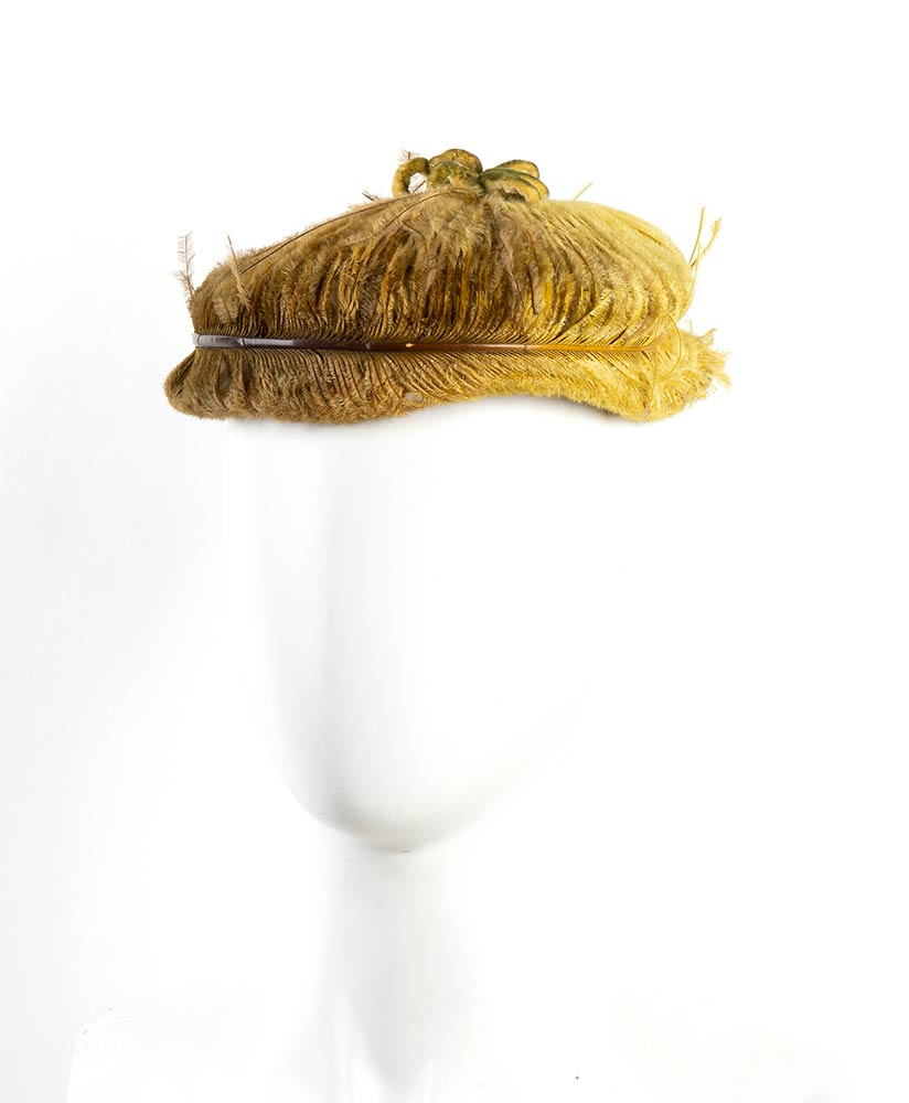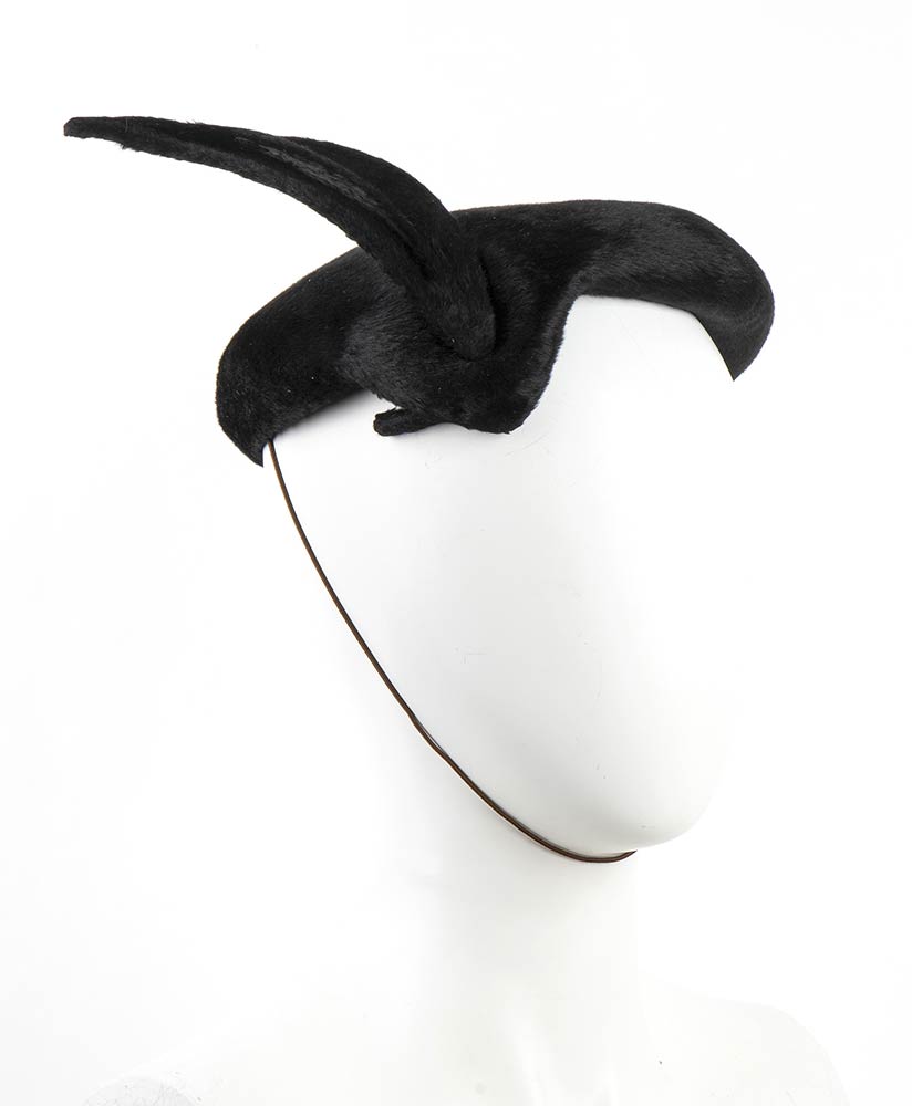 Lotto di 3 cappelli 1) Cappello Gilbert Orcel in raso avorio, tulle e bottone gioiello 2) Cappello in piume di marabou in varie tonalità di giallo, 3) Cappello in feltro di coniglio nero