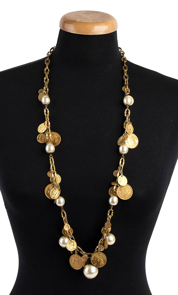 Collana in metallo dorato perle finte e ciondoli a moneta di differenti dimensioni