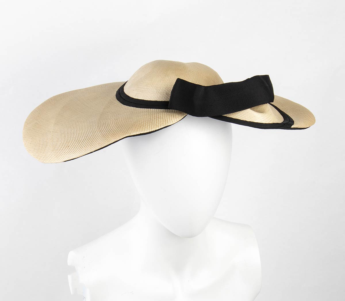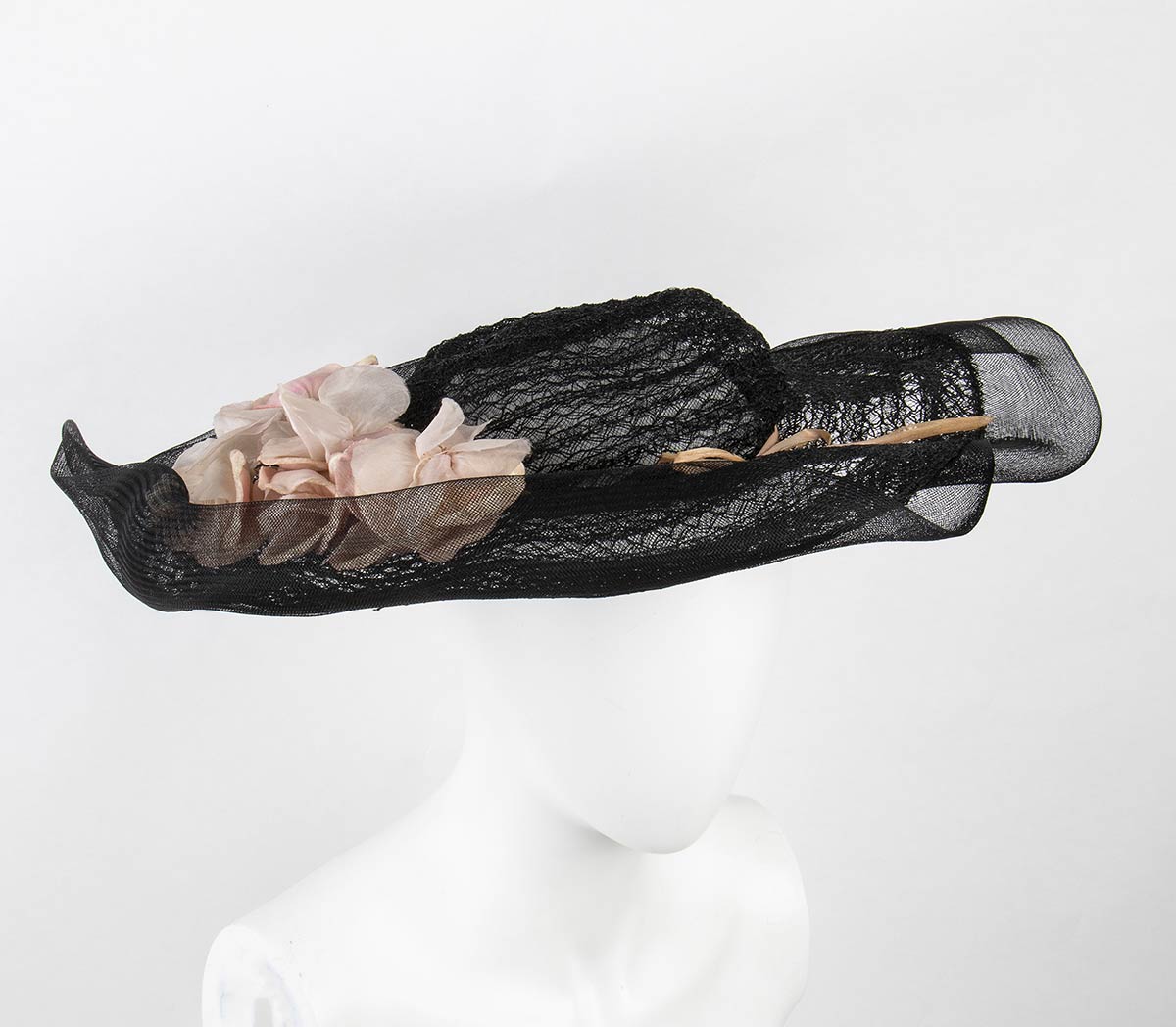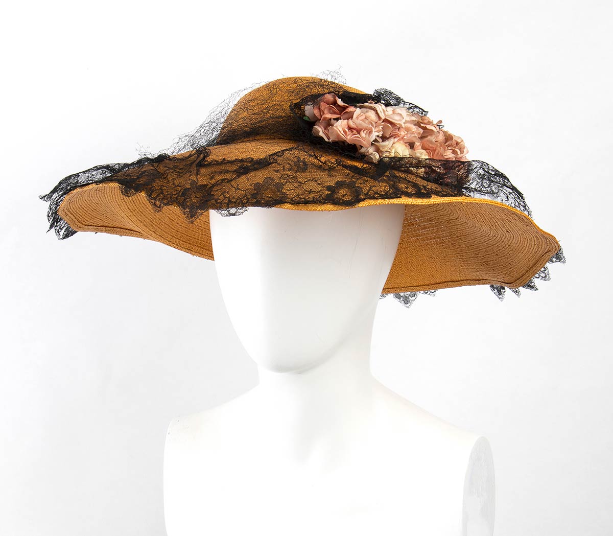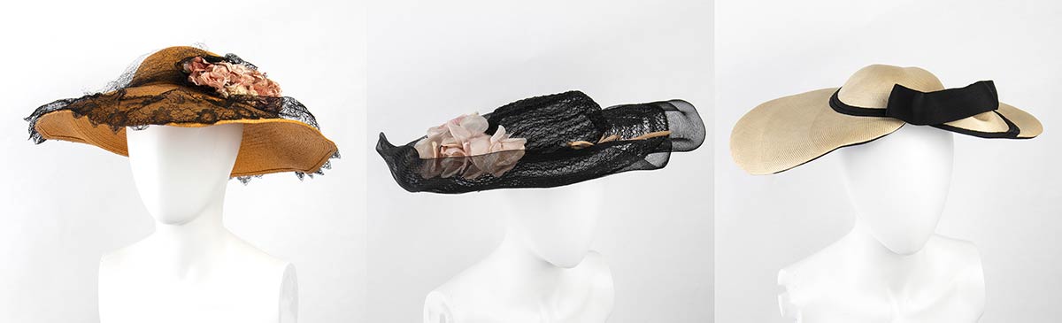 Lotto di 3 cappelli 1) Cappello a tesa larga in paglia color natural pizzo nero e fiori rosa in stoffa 2) Cappello in paglia color avorio e nastro inn grosgrain nero, tesa larga forma a cuore 3) Cappello in pizzo nero e gazar a tesa larga e fiori in stoffa
