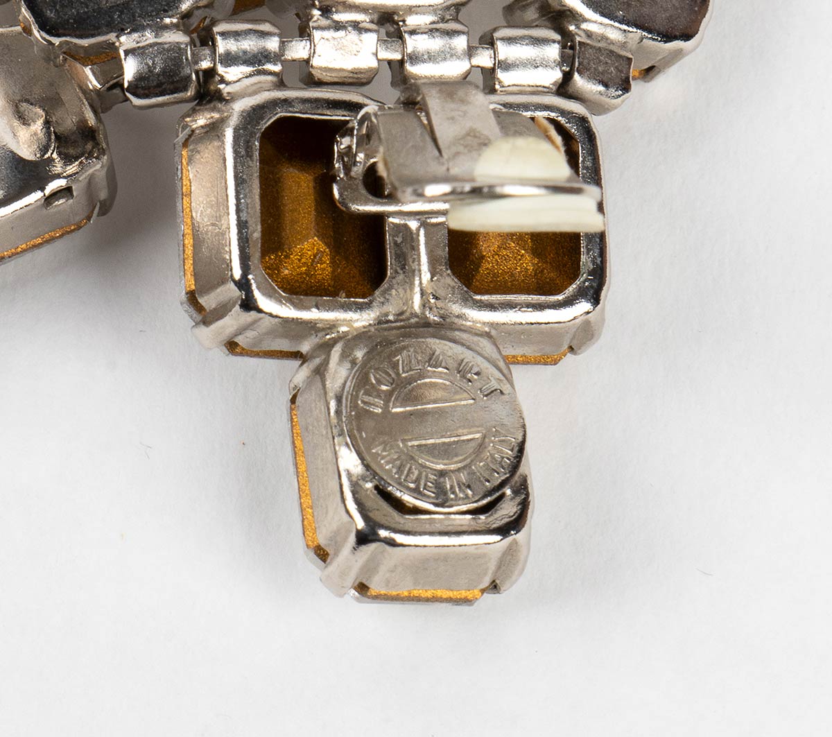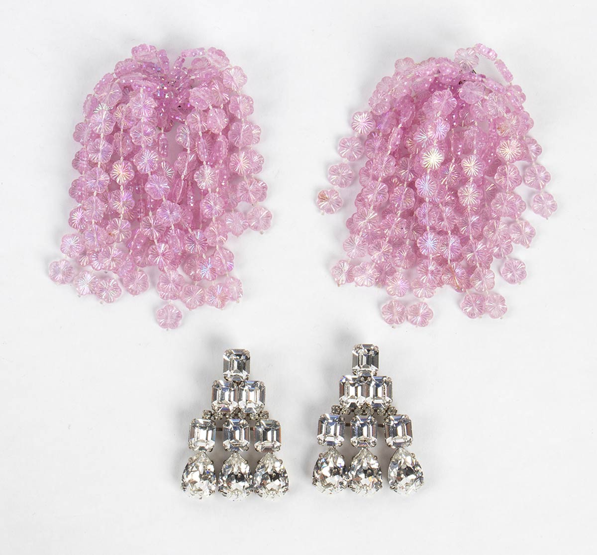Lotto di 2 paia di orecchini anni 1) Orecchini a clip bozart, metallo argentato e grandi strass 2) Orecchini a clip in plastica rosa , modello a cascata