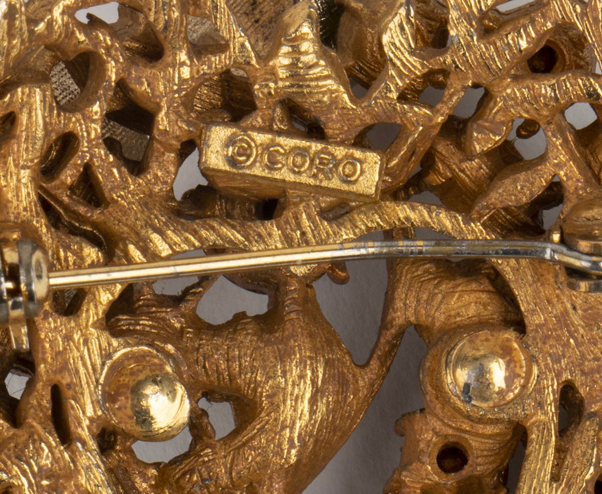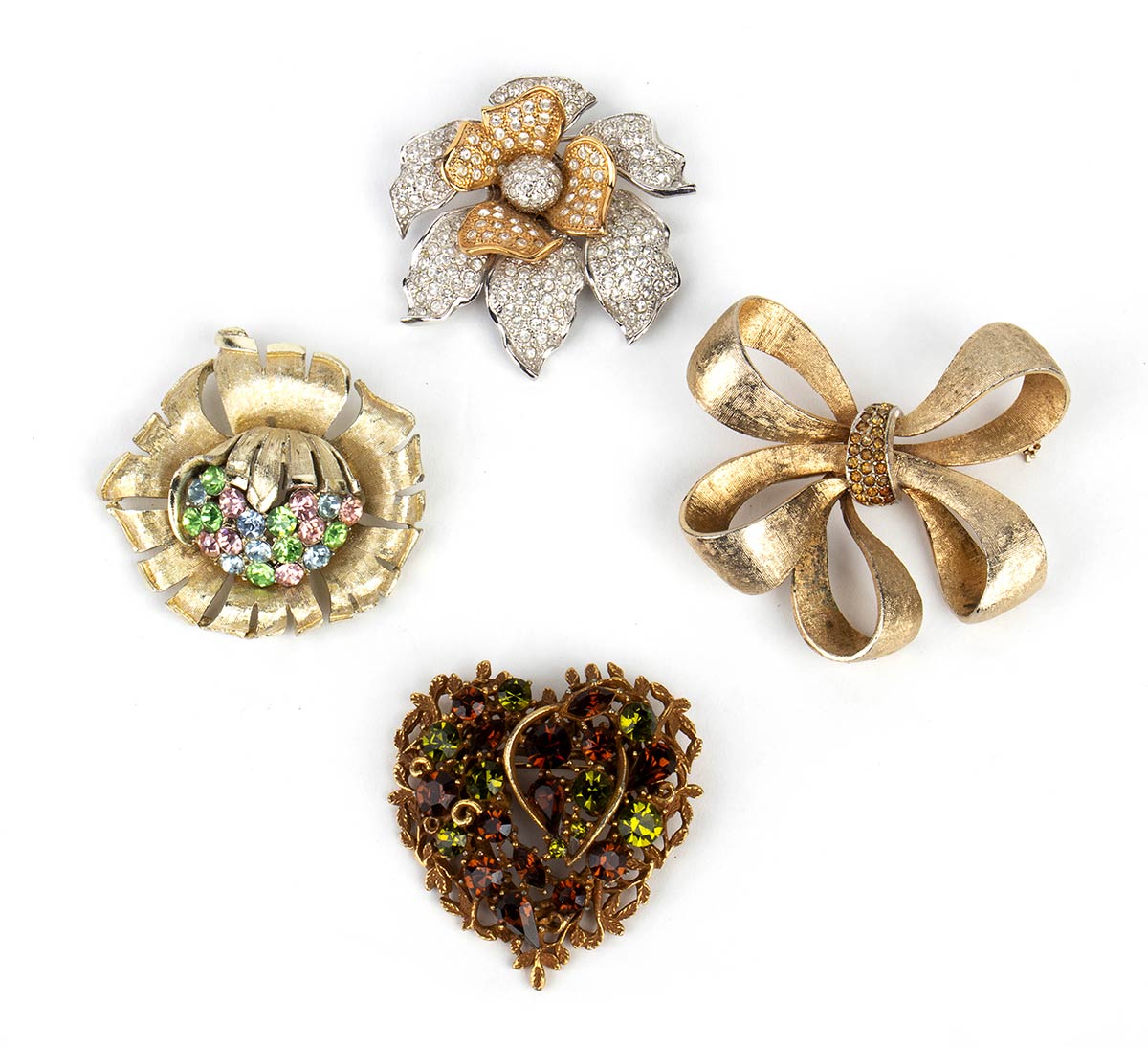 Lotto di 4 spille:1) Spilla Cascio a forma di fiore in metallo dorato e argentato strass 2) Spilla Coro a forma di fioccco in metallo dorato e strass marroni 3) Spilla Coro a forma di fiore in metallo dorato e strass multicolori 4) Spilla Coro a forma di cuore in metallo dorato traforato strass marroni e verdi