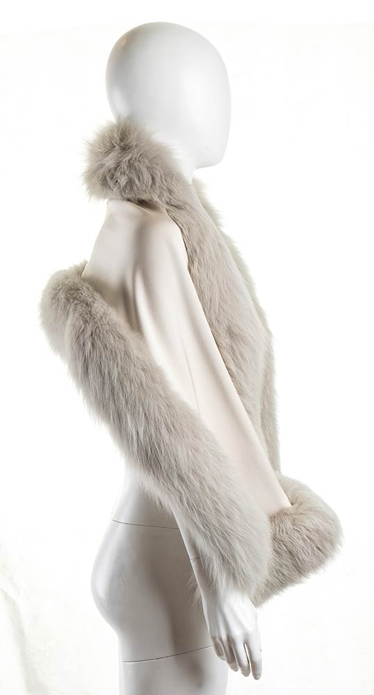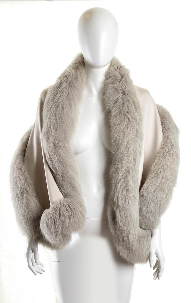 Stola in seta bianco burro bordo in pelliccia di volpe grigia