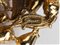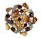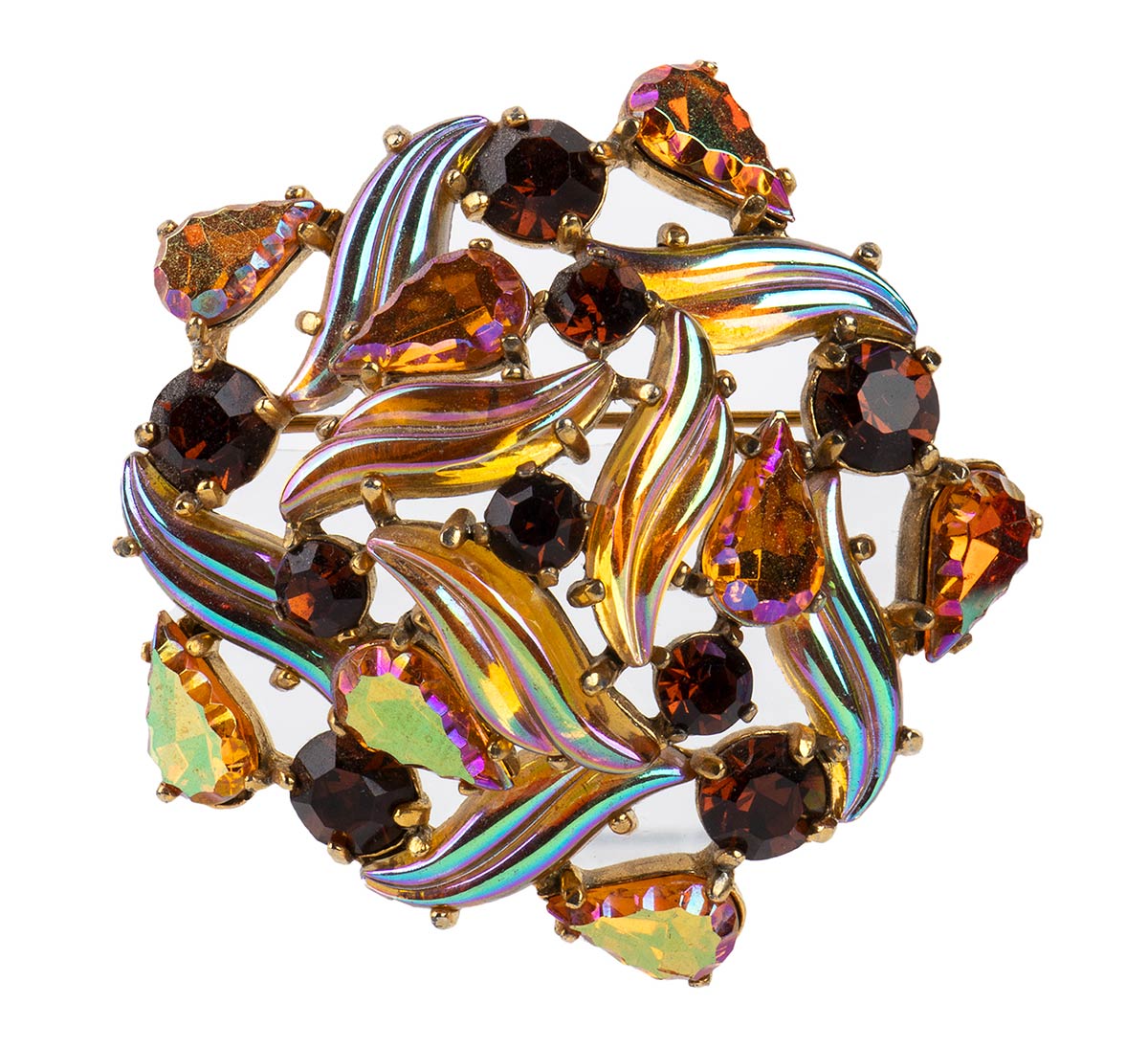Spilla in metallo dorato, elementi in plastica opalescente arancione, strass color cognac e marrone