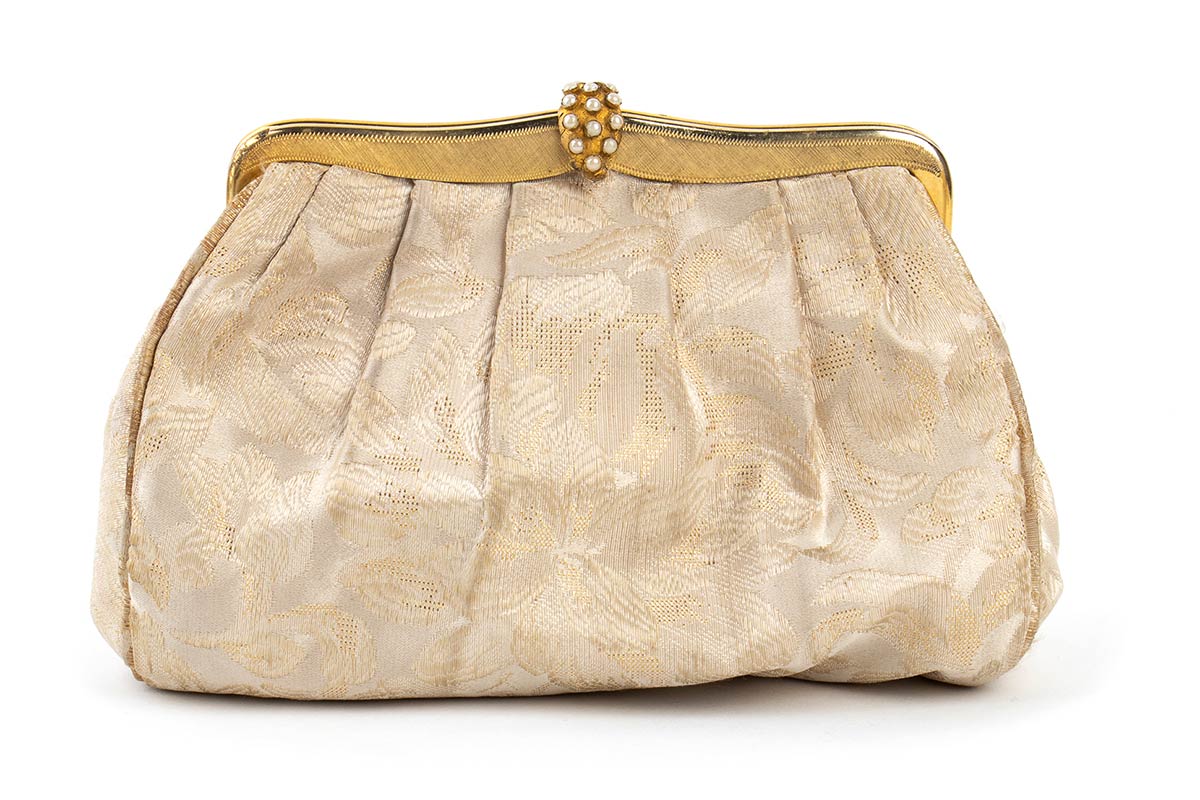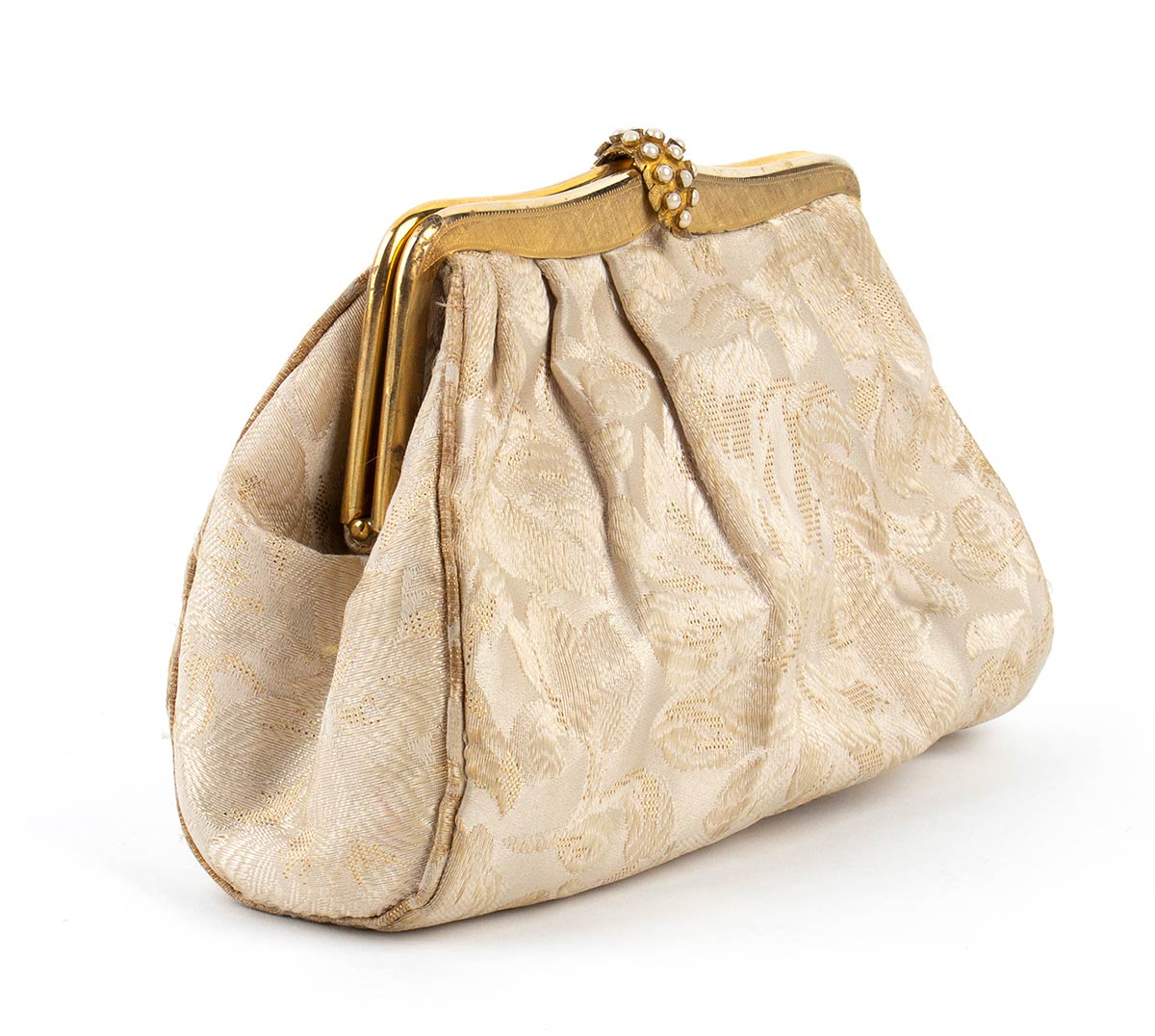 Borsetta da sera in seta jacquard color avorio minuteria dorata e chiusura con micro perle, scatola originale
