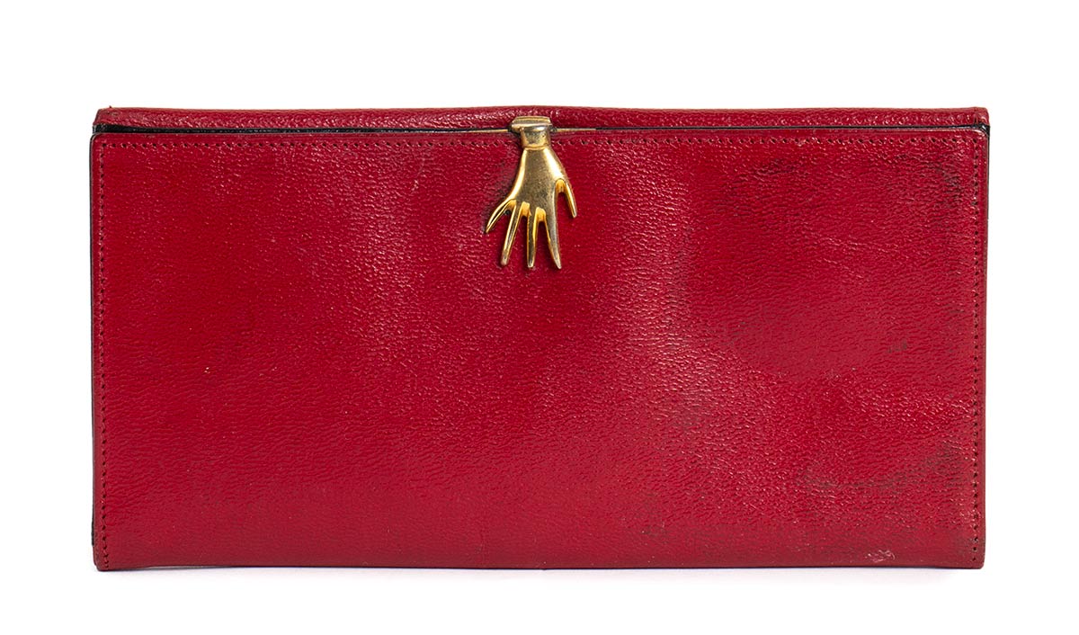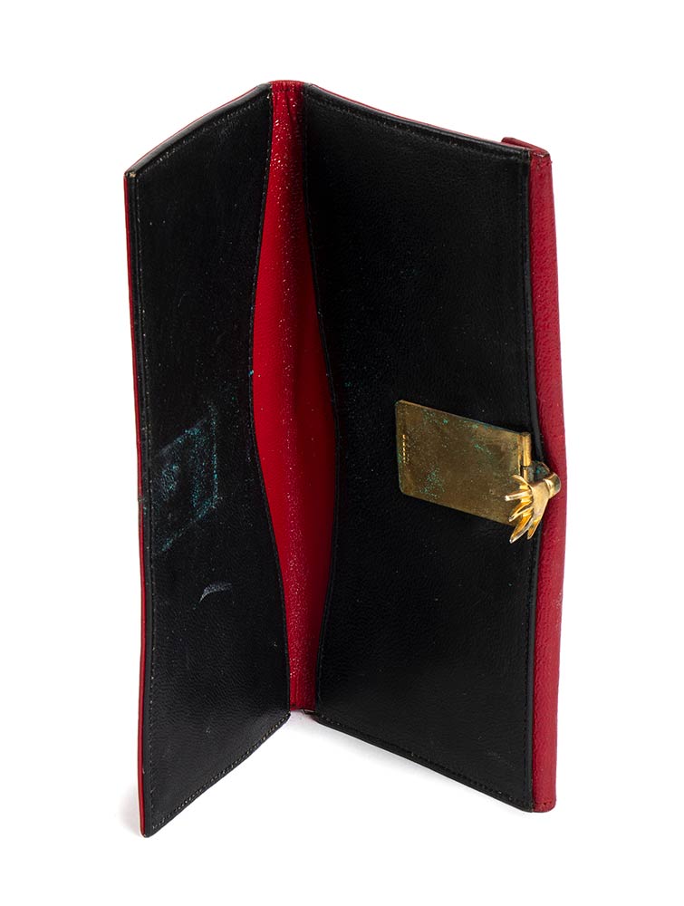 Portafoglio in pelle nera e rossa, chiusura in metallo dorato a forma di mano