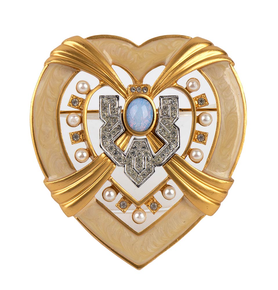 Spilla in metallo dorato, smalto beige con finitura perlata, strass, perle finte e centrale con pasta ad imitazione dell'opale, cm x cm,