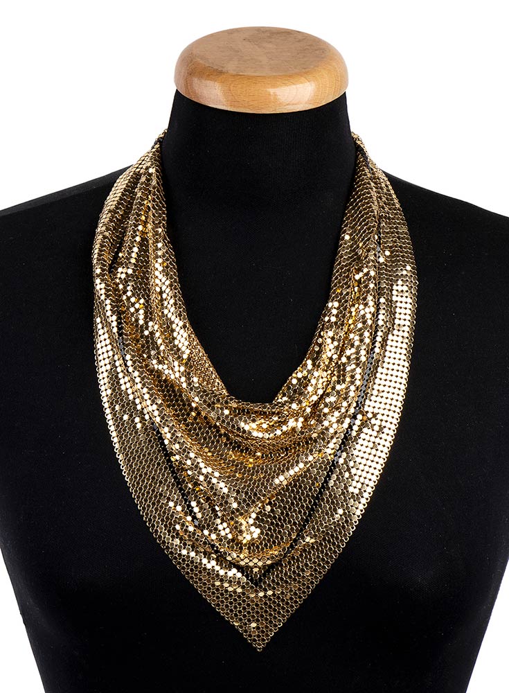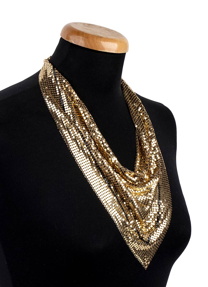 Collana anni 70 Whiting & Davis in maglia di metallo dorata, modello bandana morbido sul collo