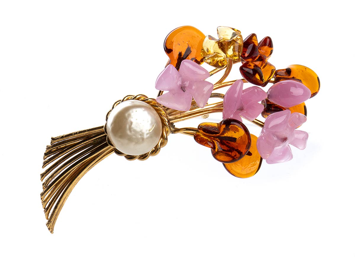 Spilla in metallo dorato fiori in pasta vitrea colorata finta perla mabé