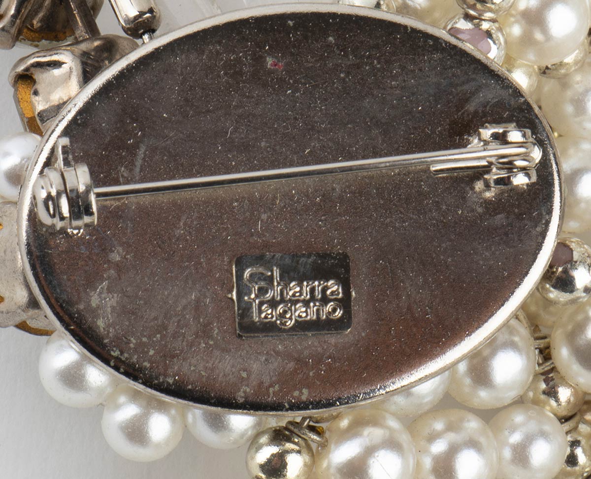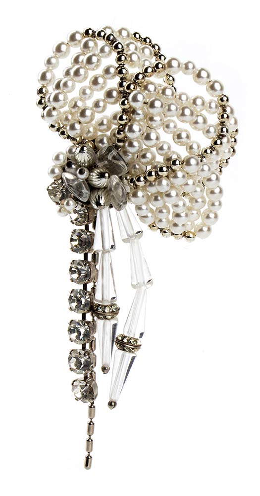 Spilla in metallo argentato finte perle di diversi colori, strass, perline
