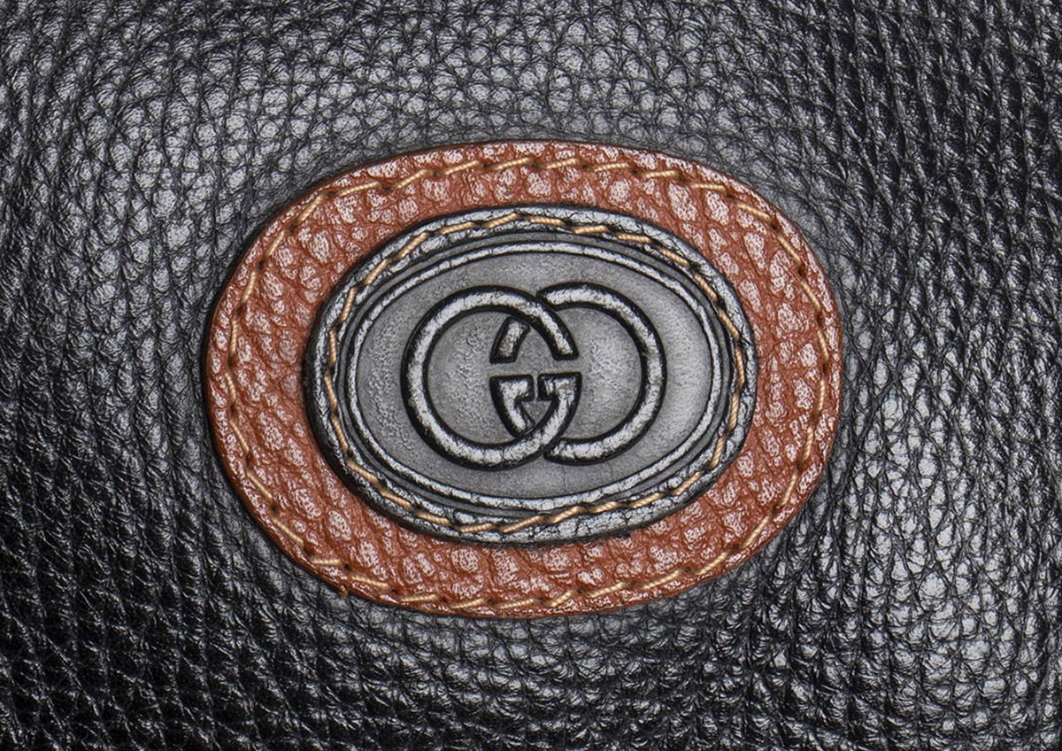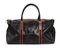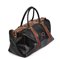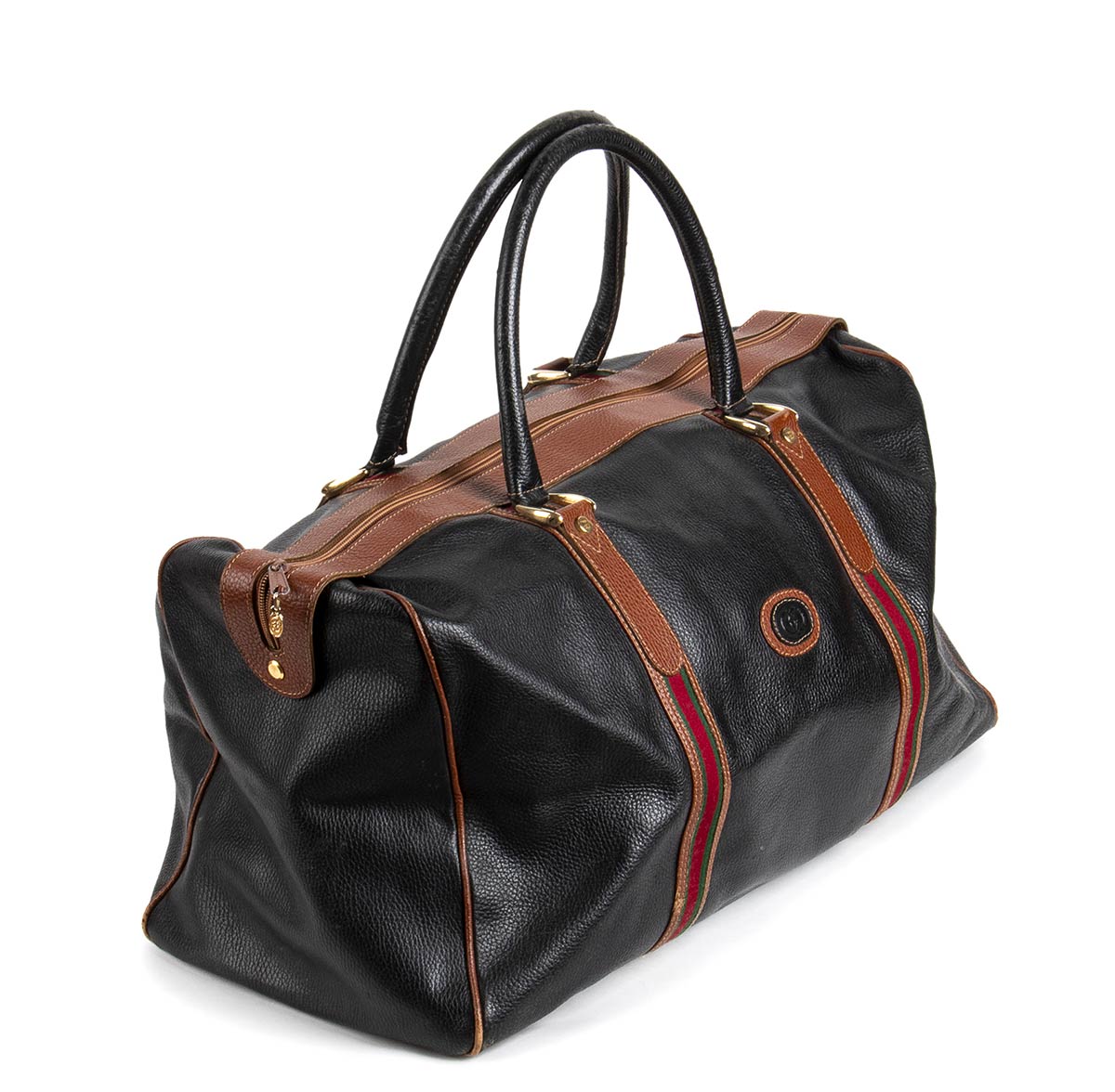 Borsa da viaggio in pelle marrone e nera, strisce in tessuto nei colori rosso e verde della maison