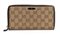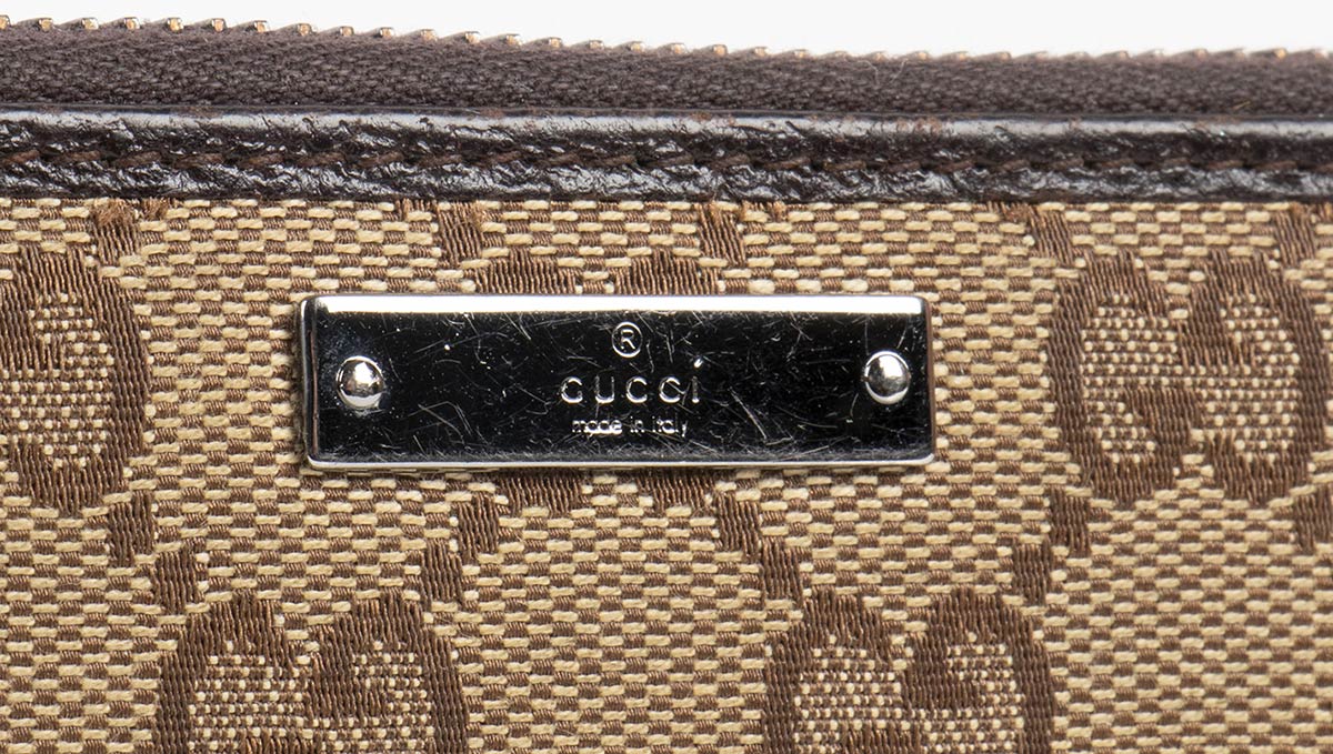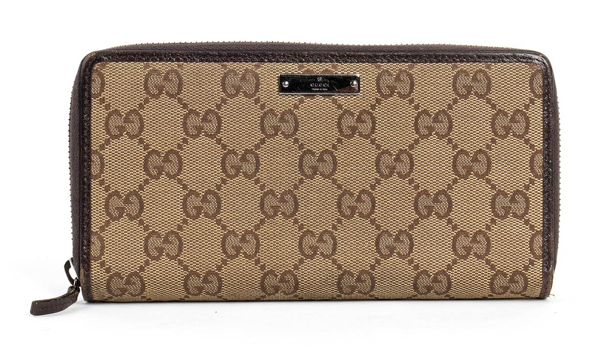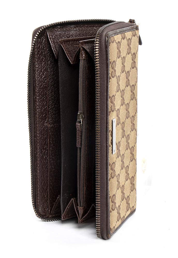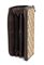 Portafoglio in tela beige con monogramma e pelle marrone, chiusura con zip