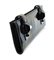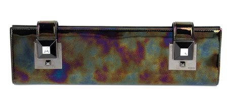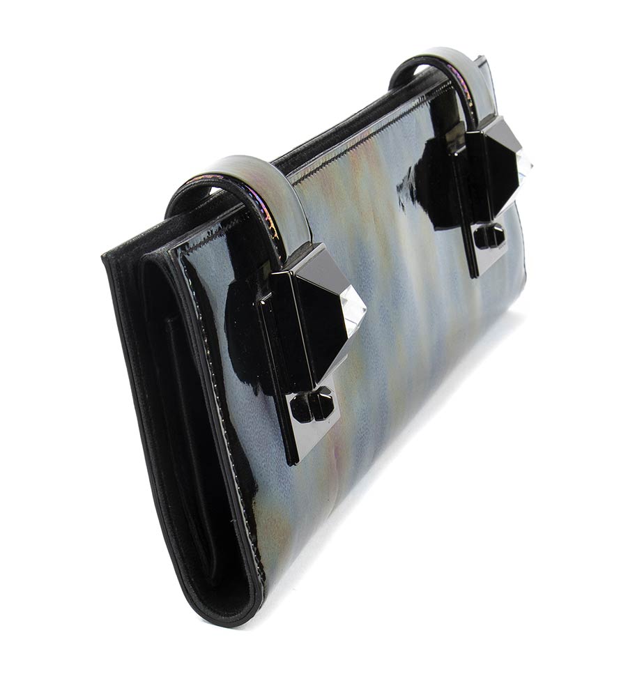 Borsa clutch in vinile nero opalescente, chiusure in metallo argentato smalto nero e strass
