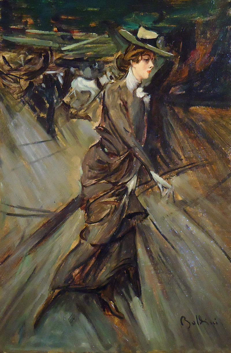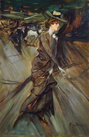 Giovanni Boldini La promenade, 1894 - 95 Olio su tela, cm. 35x24,5 Firmato in basso a destra. Sul verso: etichetta "Galerie Léon Gérard expert tableau modernes de l'ecole francaise", Paris, con descrizione. Certificato di Autenticità di Piero Dini su foto. Bibliografia: Francesca Dini "Boldini e gli Italiani a Parigi, Tra realtà e impressione", Silvana Editoriale, pag. 244, 245.