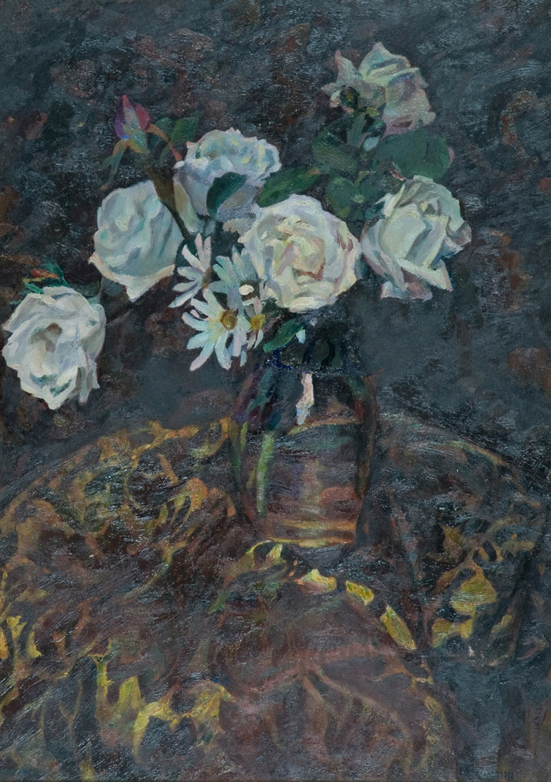 Mario Puccini Rose bianche, 1905 - 1910 Olio su tavola, cm. 48x35,5 Firmato in basso a destra. Sul verso: scritti di provenienza. Bibliografia: "Mario Puccini, per un catalogo dell'opera", Andrea Baboni, edizioni Pananti, Firenze, pag. 203, n° 49; "Catalogo studio Matteucci, 1973, 8° Biennale d'Antiquariato", n° 20, pag. 48, tav. 20; "M. Puccini", Riccardo e Ferdinando Tassi, Edizioni Il Torchio, Firenze, pag. 336, n° 593; "Catalogo di quadri moderni", Galleria Galardelli, Firenze, 1924, n° 171.