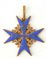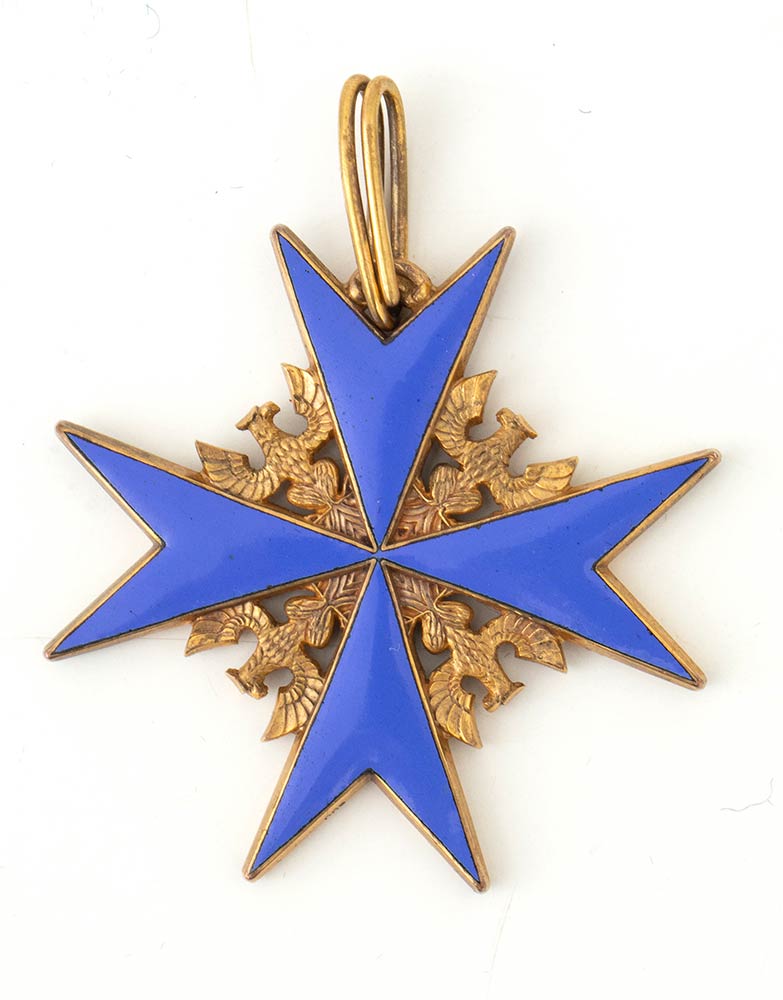 La più alta decorazione concessa per meriti di guerra, croce in argento dorato accantonata di aquile con monogramma del fondatore ed anno di fondazione, al verso smalto liscio, marcata 800 e W sul braccio inferiore della croce, senza nastro, in ottimo stato
