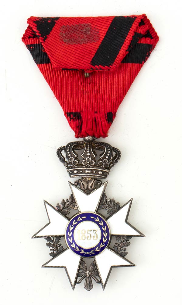 Insegna di cavaliere in argento dorato e smalti, smalti integri, bel nastrino originale all'austriaca, smalti integri.