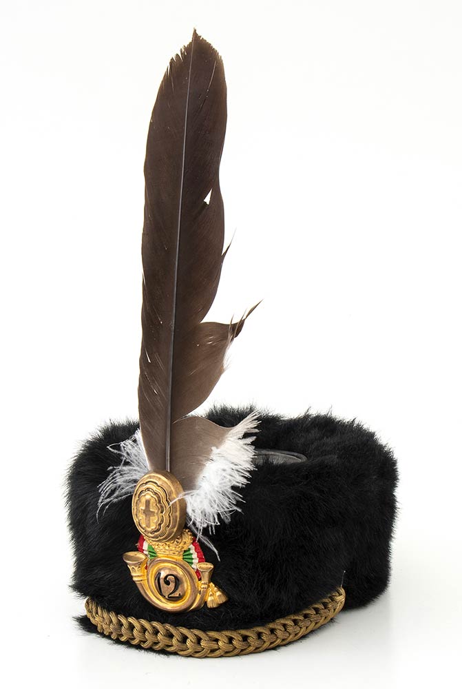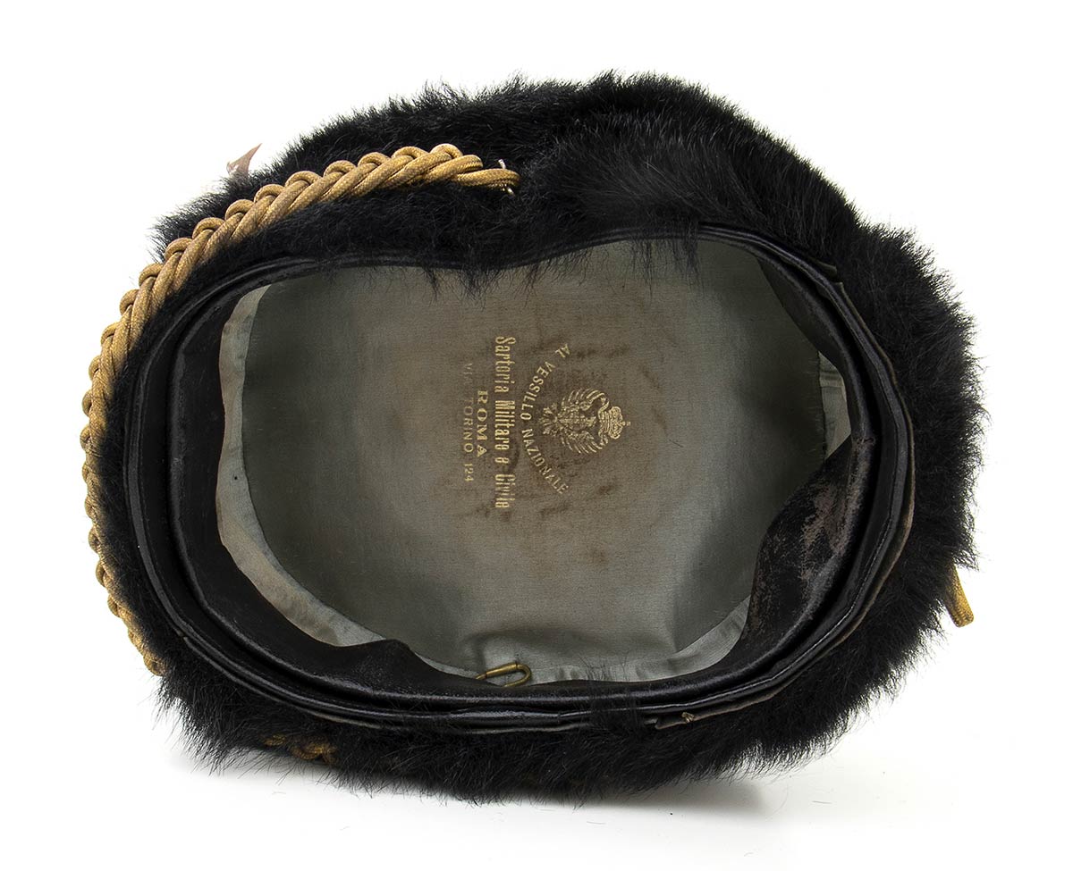 In pelo naturale con cordone fregio, nappina e penna, interno in seta con marchi del fabbricante, molto bello ed in ottimo stato.