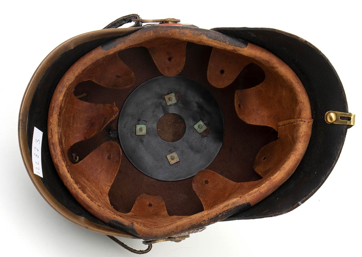 Elmo composito, scocca in cuoio con segni di altre metallerie applicate, bel fregio bavarese da shakot, completo di soggolo e coccarde.