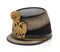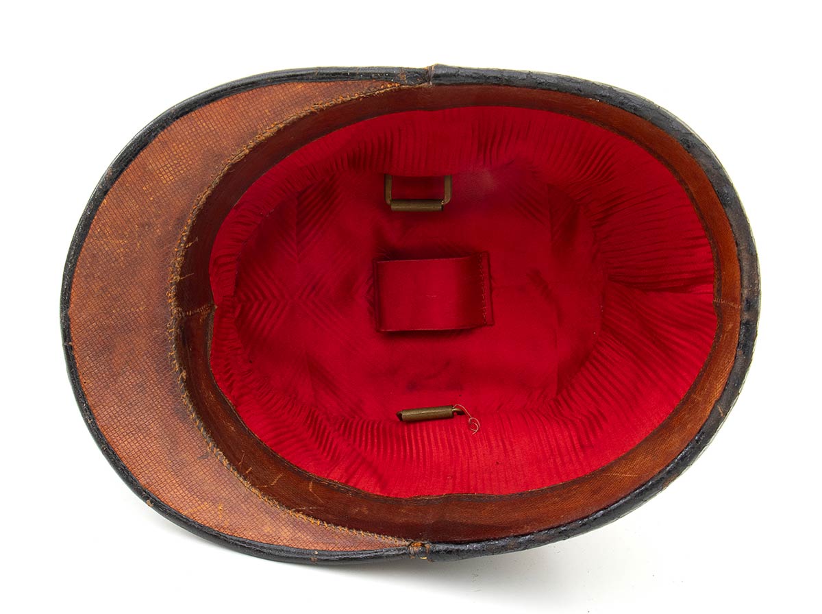 Scafo rigido ricoperto di panno nero, completo di trecciola e coccarda, fodera plissettata di seta rossa, in ottimo stato.