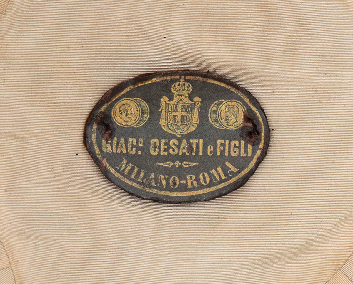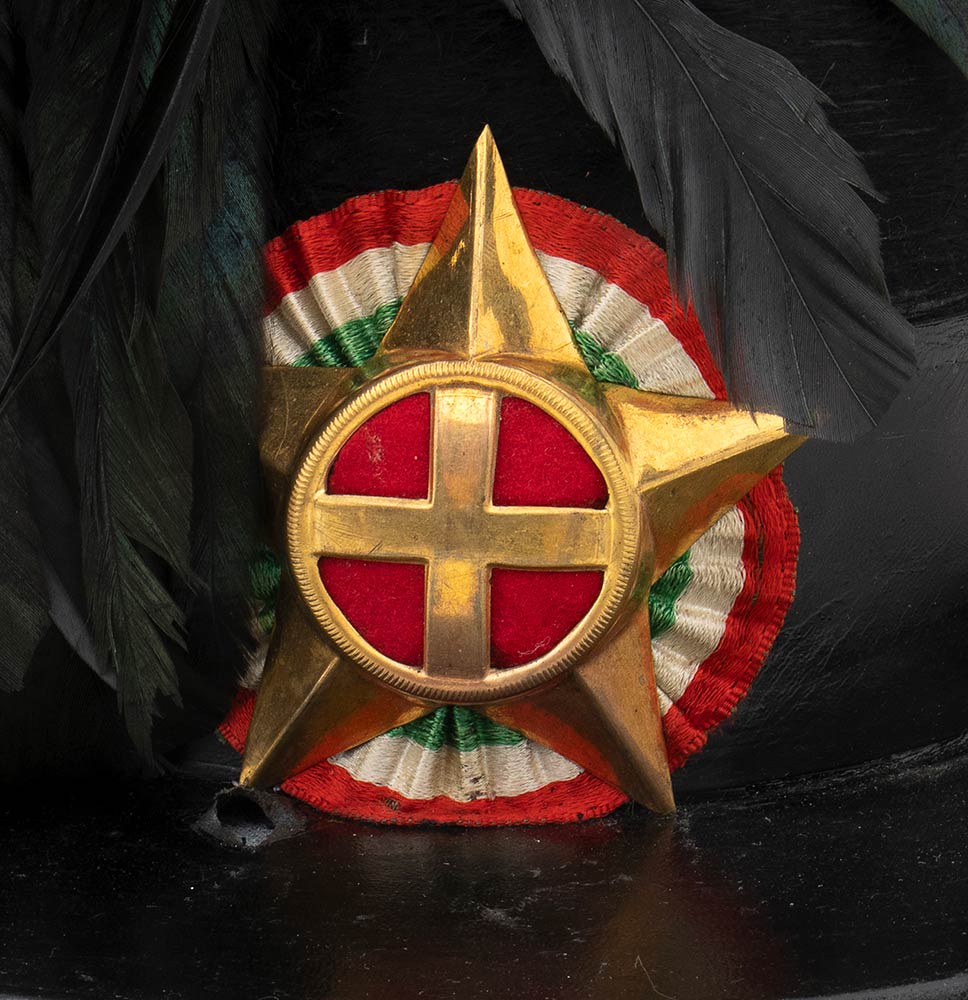 Fusto rigido di feltro pettinato con cupola molto alta e tesa piccola, bel fregio a stella dorato con croce sottopannata rosso scarlatto, fodera in seta, bello ed in ottimo stato.
