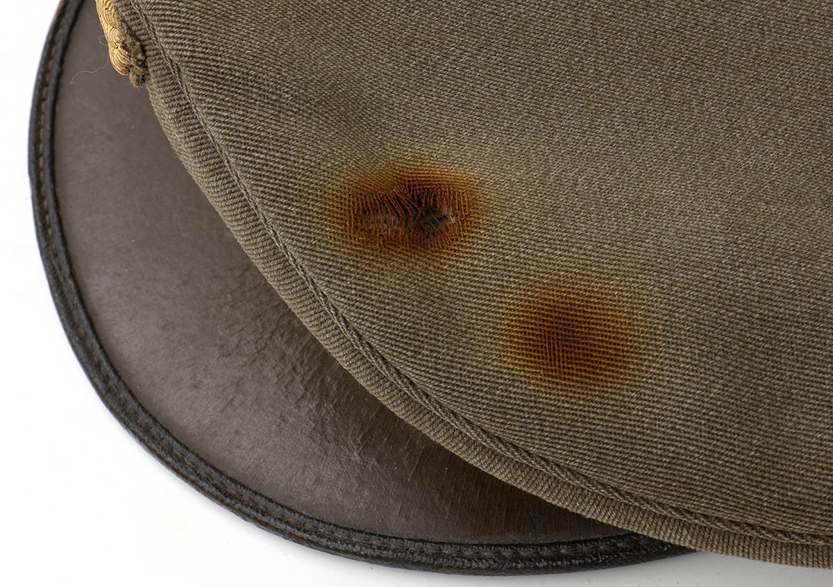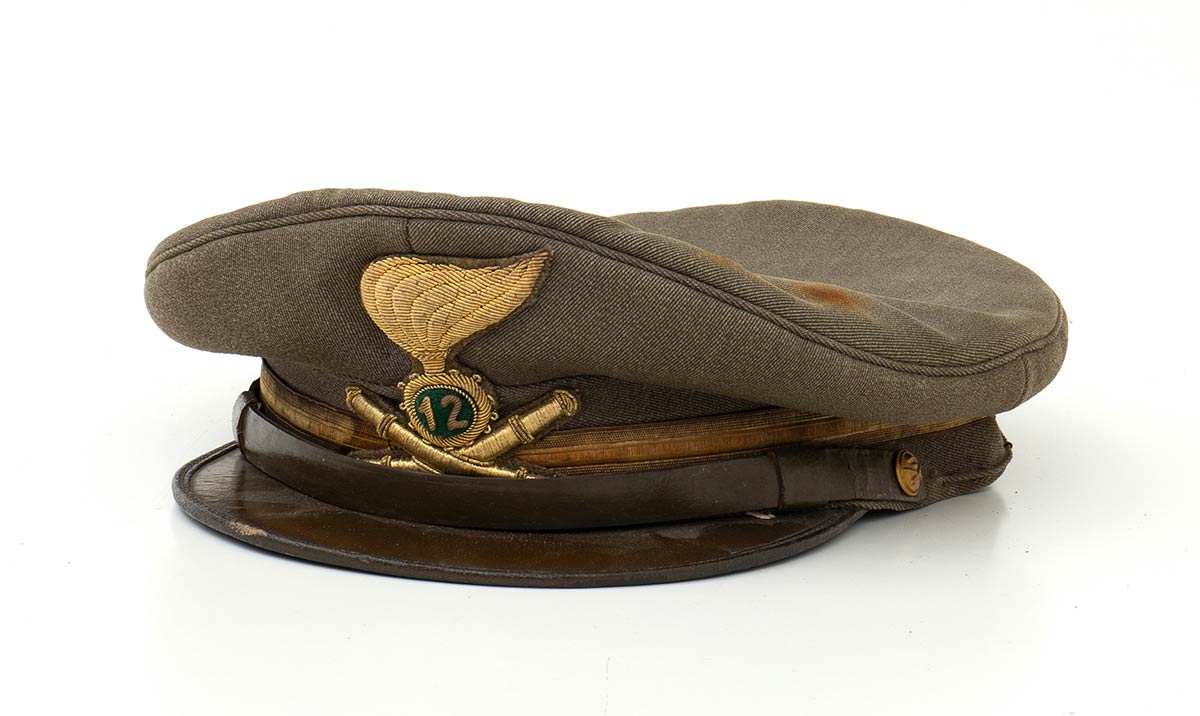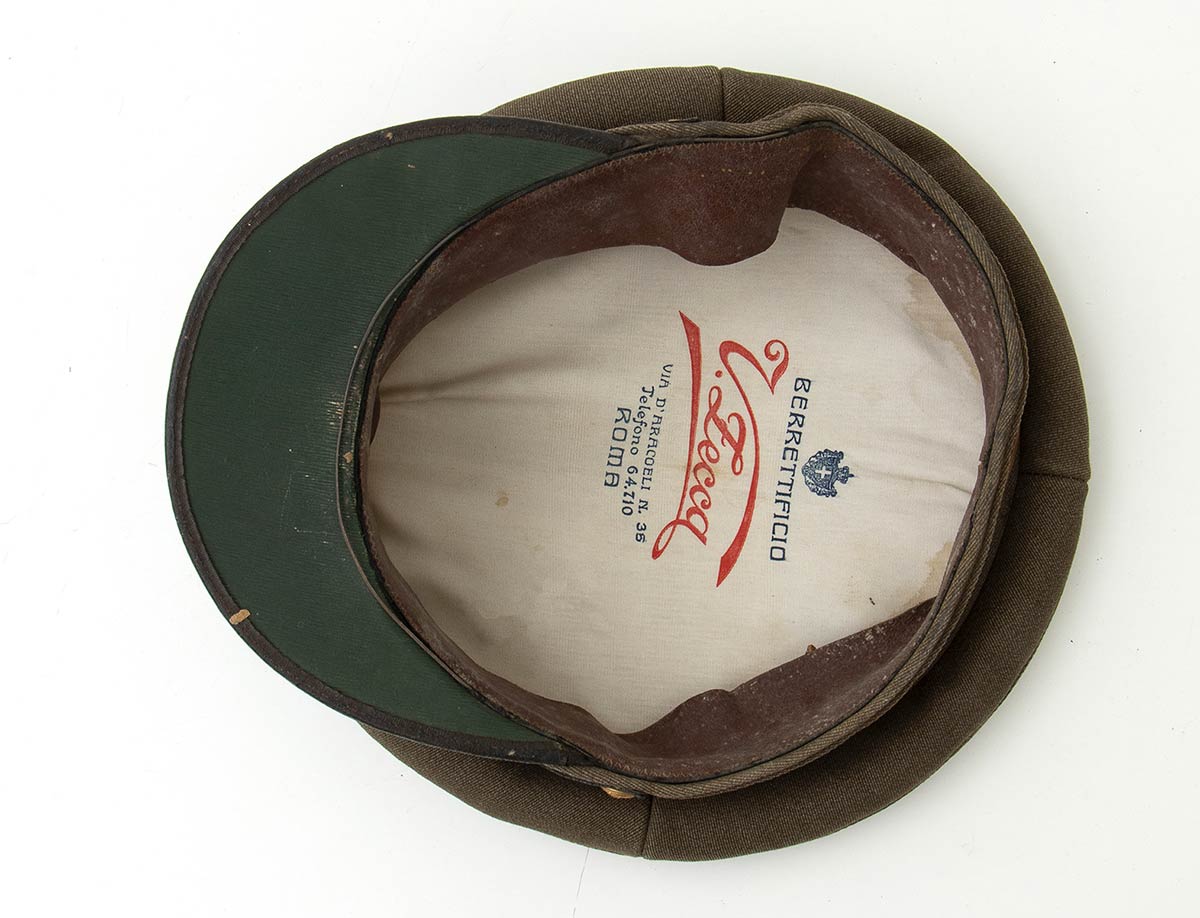 In gabardina caki, grado da sottotenente, bel fregio in canottiglia, visiera e soggolo marroni, interno in seta con marchio del fabbricante, bottoncini pertinenti, ha un buco provocato da bruciatura al tondo, altrimenti in buono stato.