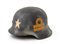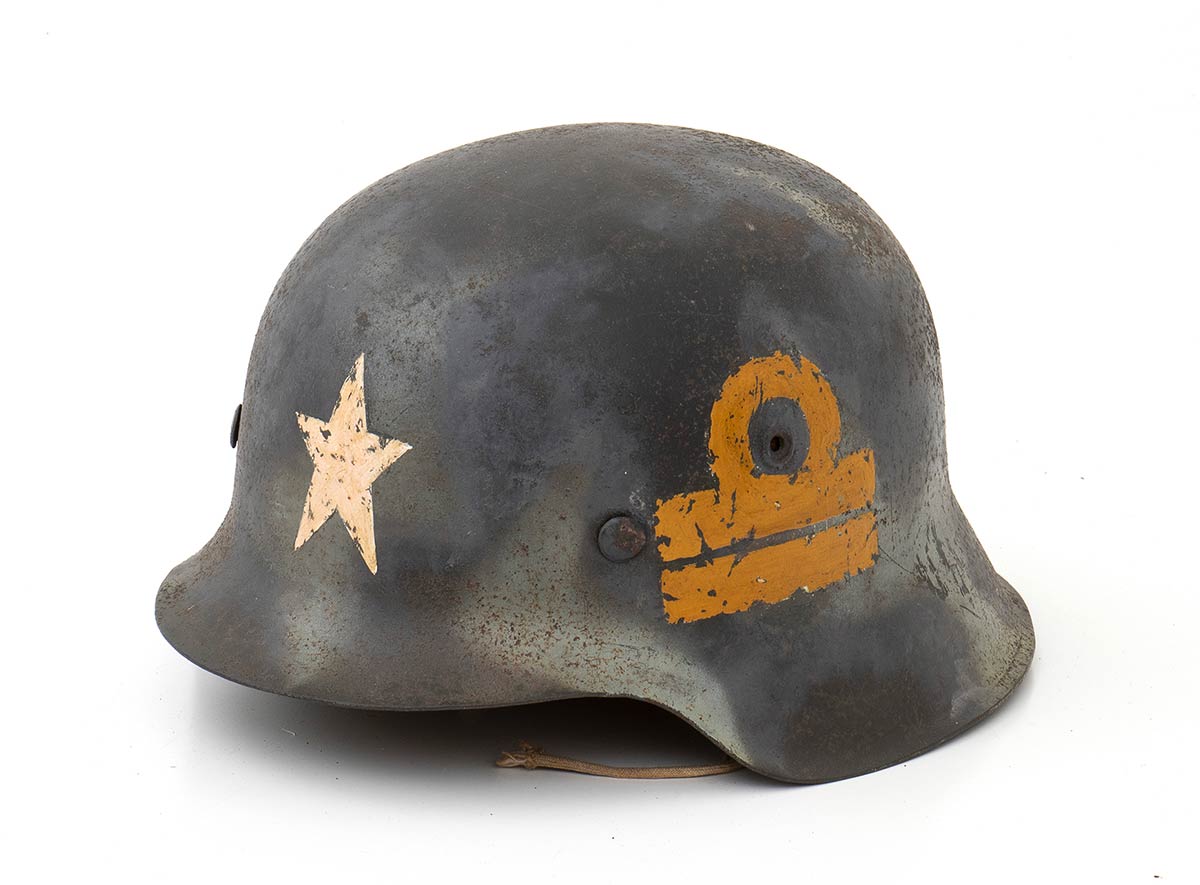 Riutilizzo di elmetto tedesco m.42 da parte di formazione partigiana, l'elmo a sfumature mimetiche, ha dipinto sulla fronte una stella a cinque punte bianca e reca al lato un grado da capitano in vernice gialla, interessante, in buono stato, manca il soggolo