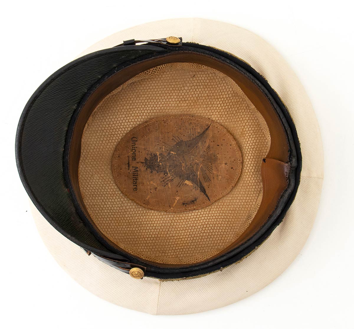 Greca ricamata in canottiglia oro con trofeo d'arma, piccola visiera spiovente sulla moda della fine degli anni venti, all'interno fodera con marchio del fabbricante, in ottimo stato