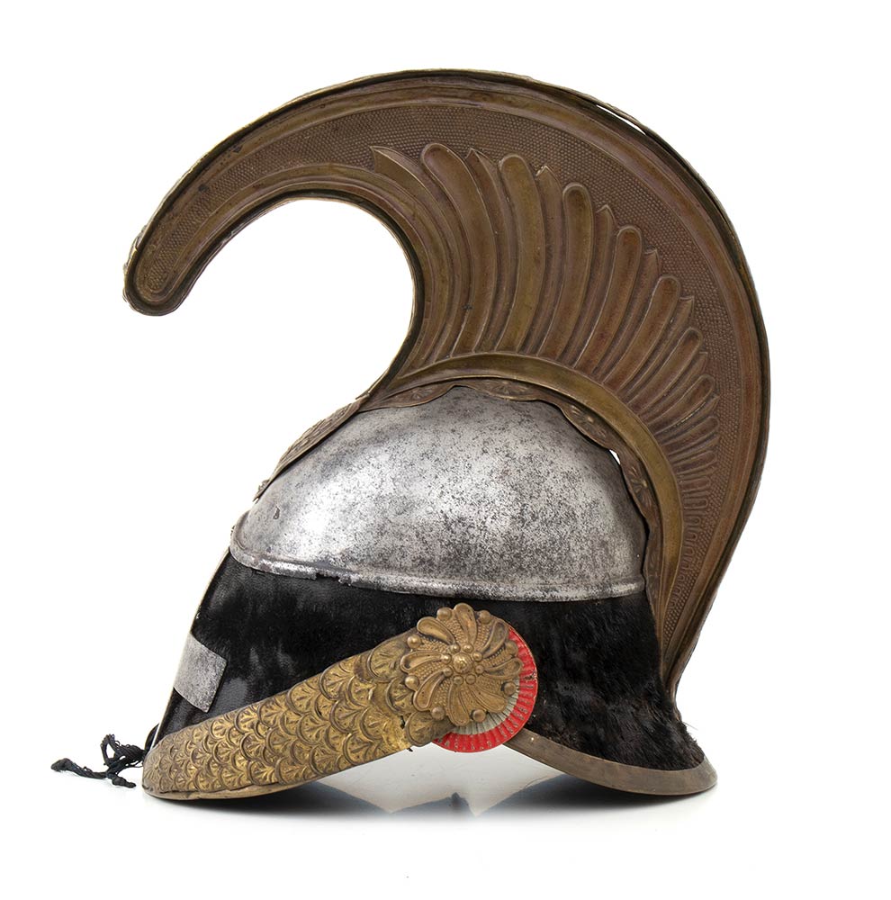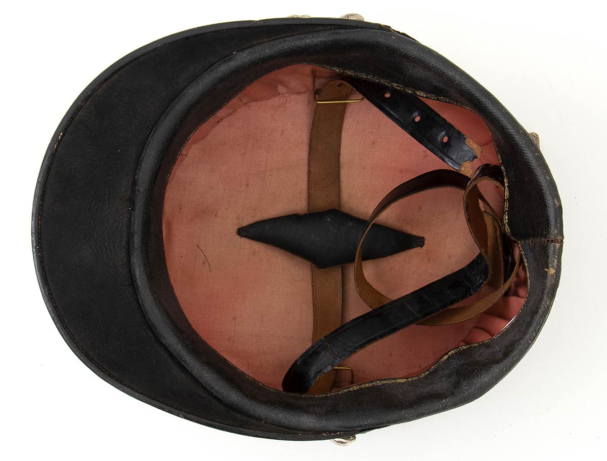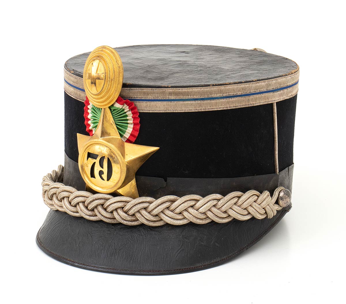 Fusto rigido ricoperto di panno, fregio e nappina in metallo dorato, gradi a lastra, interno di seta con alluda, completo ed in ottimo stato