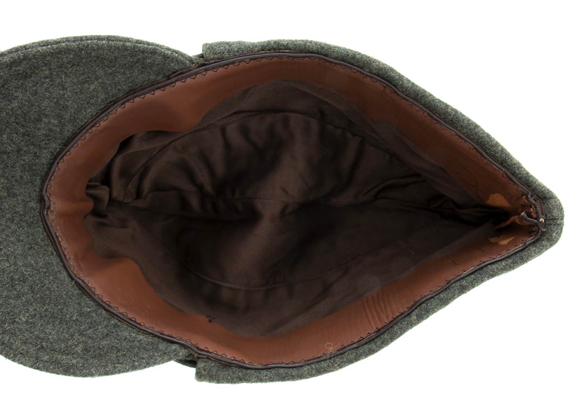 In panno di lana grigioverde con fregio dca medico MVSN ricamato in canottiglia, interno con fodera di cotone ed alluda in pelle, raro