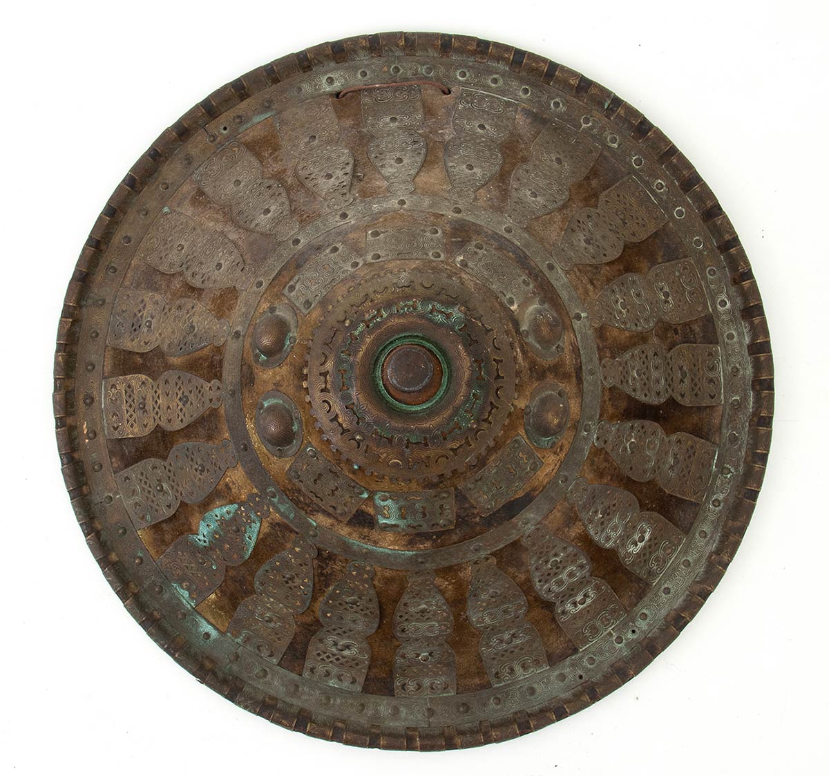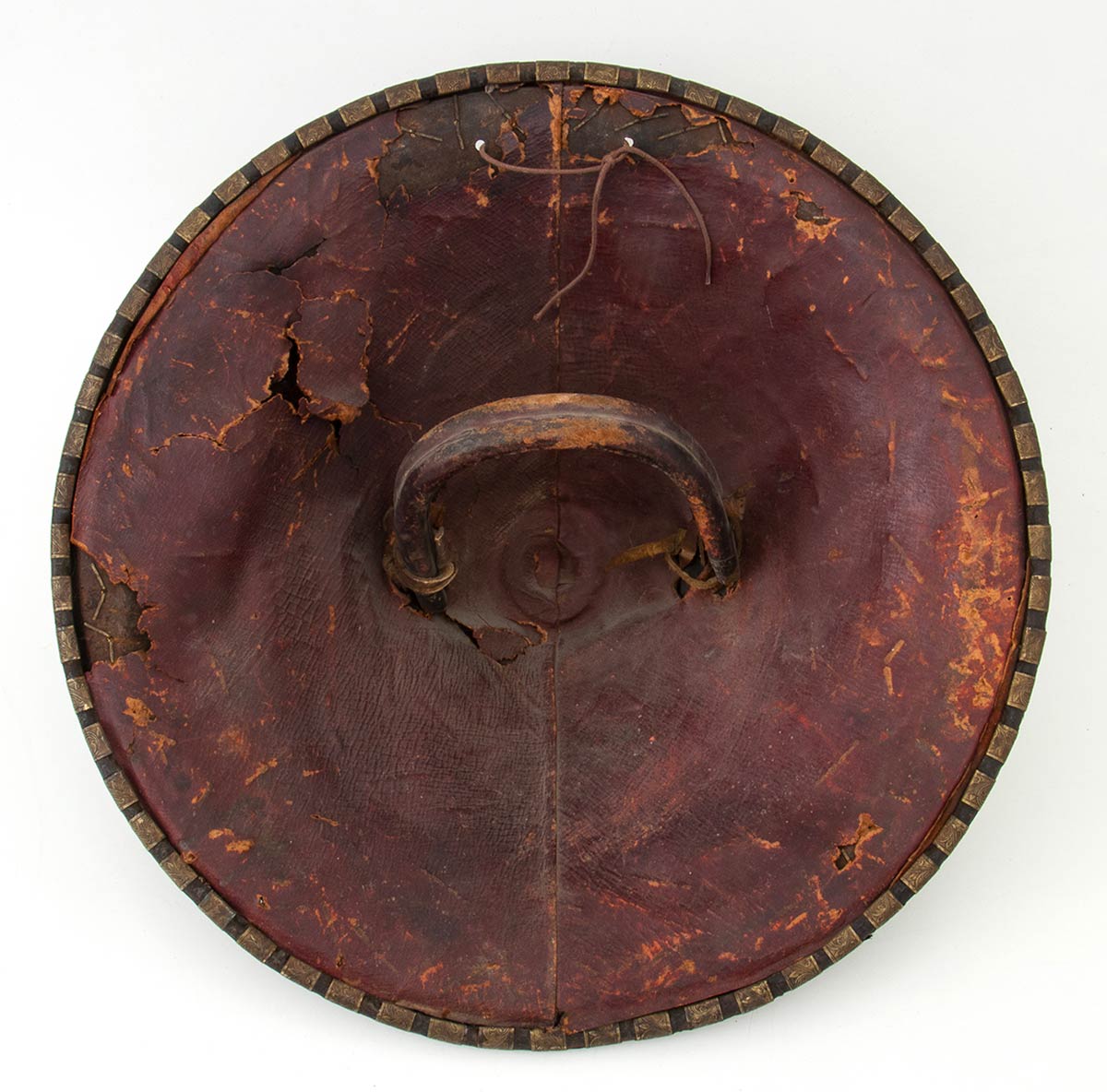 In cuoio foderato di velluto marrone ed ornato di borchie metalliche.