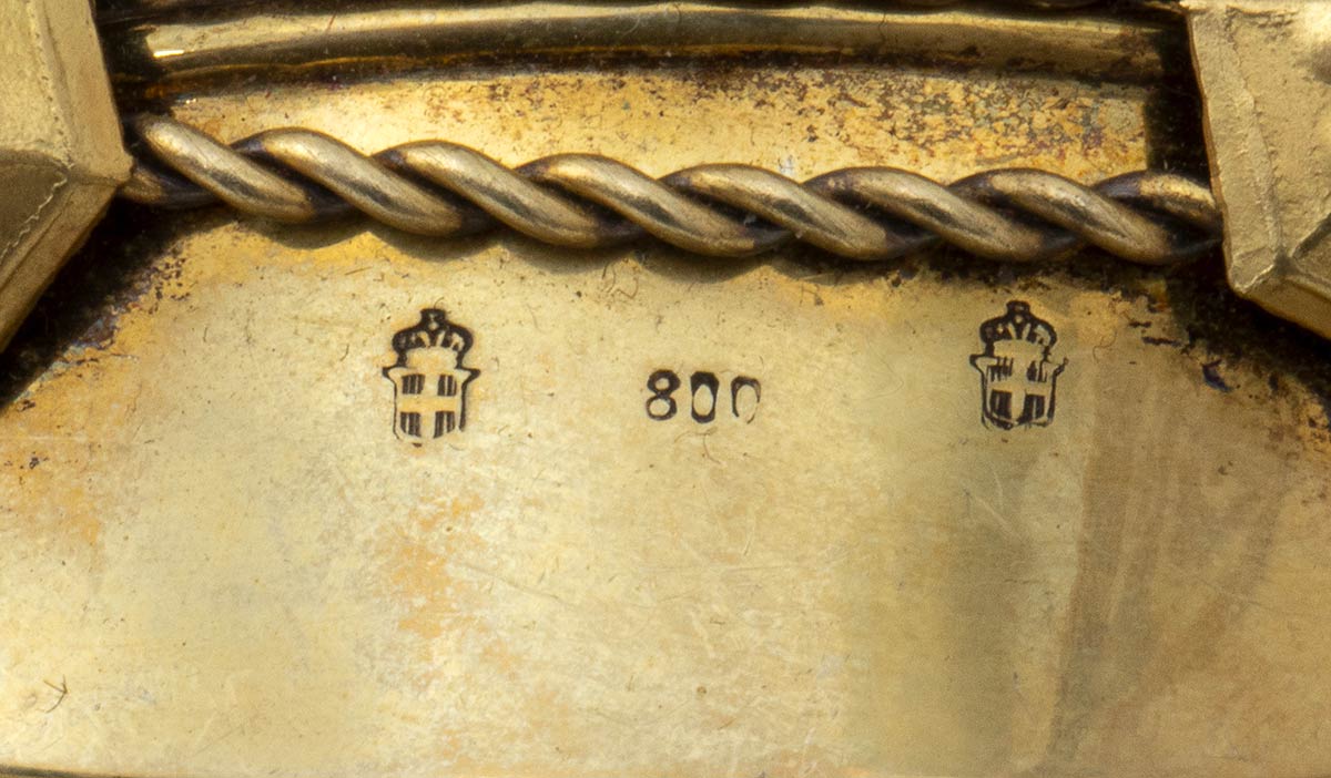 In metallo dorato con applicazioni in argento, secondo il regolamento del 1934.