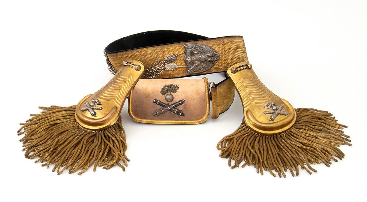 Italia, secondo quarto XX sec. Bandoliera e spalline a frangia m.34 per l'alta uniforme degli ufficiali del Regio esercito