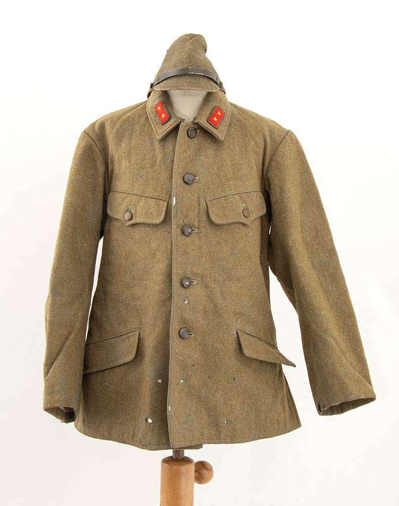 La giubba, in lana caki, è completa di mostrine di fanteria, presenta alcune camolature superficiali e non deturpanti, il berretto è in fibra d'ortica, tipico del periodo bellico, senza fregi.