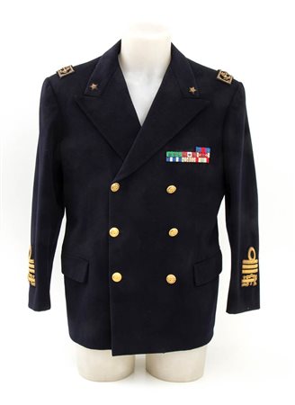 In fine castorino di lana, gradi alle maniche con greca e tre botte, travette alle spalle, e nastrini di campagna, in ottimo stato