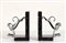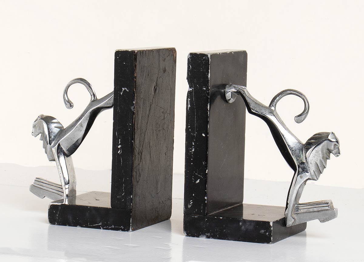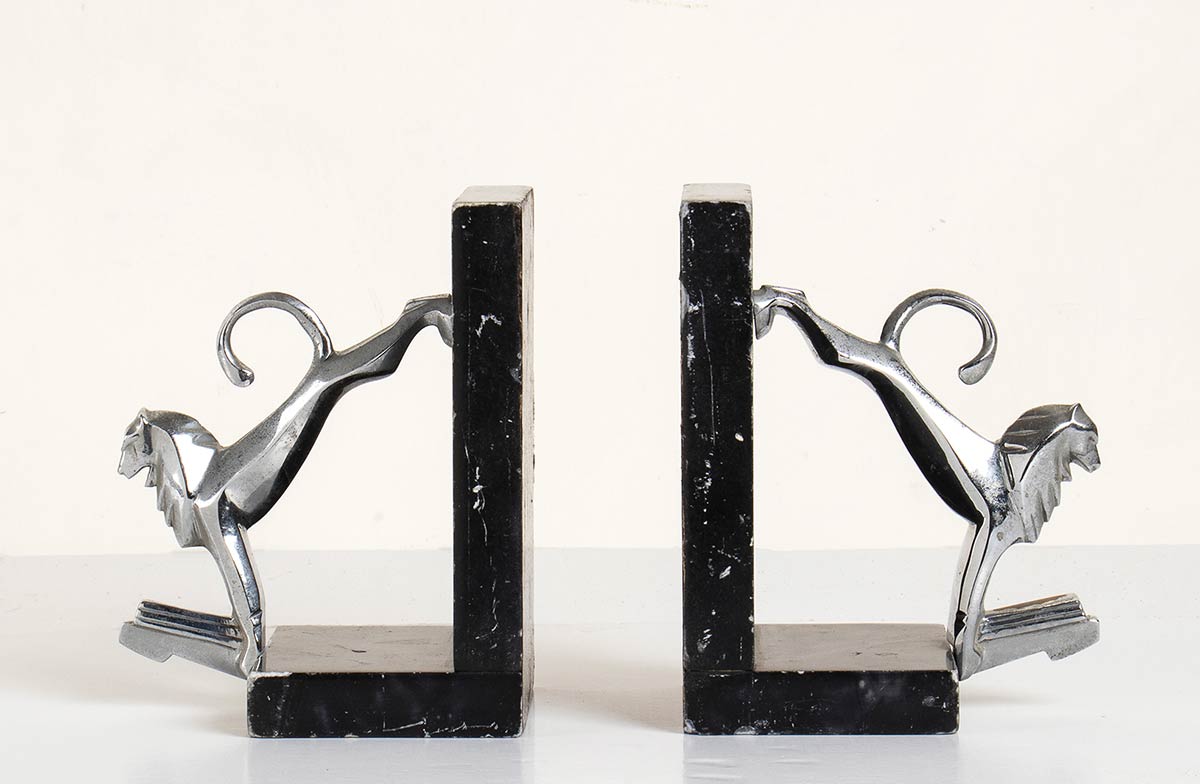 Coppia di fermalibri in marmo, con figura realizzata in metallo cromato, di leone rampante e tenente un fascio littorio tra gli artigli anteriori. Stilizzata secondo l'idea visiva del periodo decò, alla maniera dell'arte razionalista del ventennio fascista. Misure cm.14x9 la basetta in marmo, per una altezza totale di circa cm.14