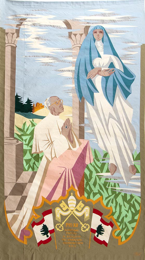 Arazzo ricamato in filo di lana, con PAPA PIO XII inginocchiato ai piedi della Madonna Nostra Signora del Libano rappresentata a figura intera, in abito bianco e velo azzurro in testa, con sfondi . Nel 1954 in occasione del cinquantenario della costruzione del santuario di Nostra Signora del Libano, ad Harissa, il Cardinale Angelo Roncalli (futuro Giovanni XXIII) si recò in pellegrinaggio presso quei luoghi a nome di Papa PIO XII, e ricevette il presente arazzo, quale dono da parte della comunità religiosa del santuario libanese, da consegnare come omaggio personale per il Santo Padre. Al centro dell’arazzo troviamo incorniciato lo stemma triregno pontificio (tiara e chiavi incrociate) con bandiere nazionali del Libano e la frase PIO XII - ASSUMPTIONIS PONTIFICI IN OCTOGESIMO PIUS ANNIVERSARIO LIBANENSIUM NATIO – D D D . In basso a destra le firme degli autori, E.Kobalter , J.Minder. L’arazzo è completo della sua scatola in legno, a valigia. Misure del solo arazzo circa cm.310x175 (Dalla alienazione di oggetti familiari di casa Pacelli)