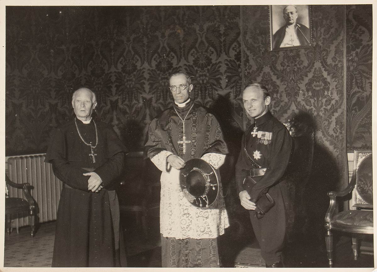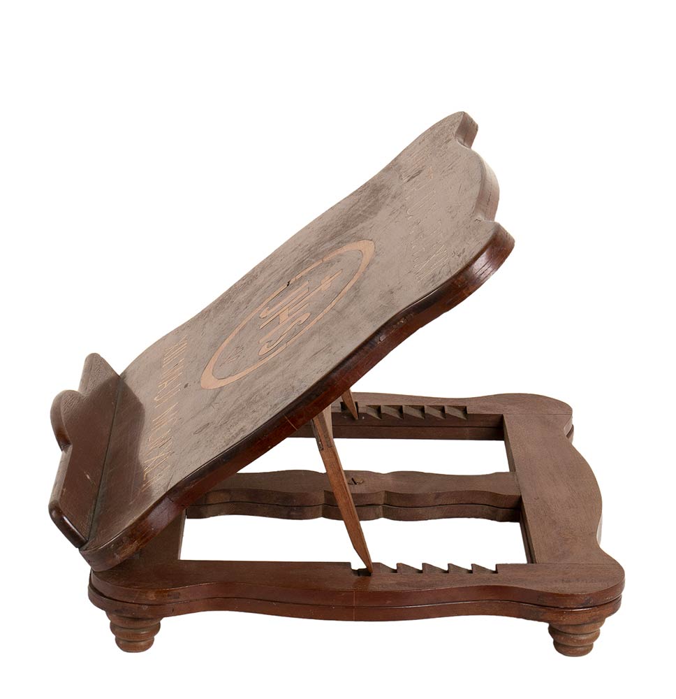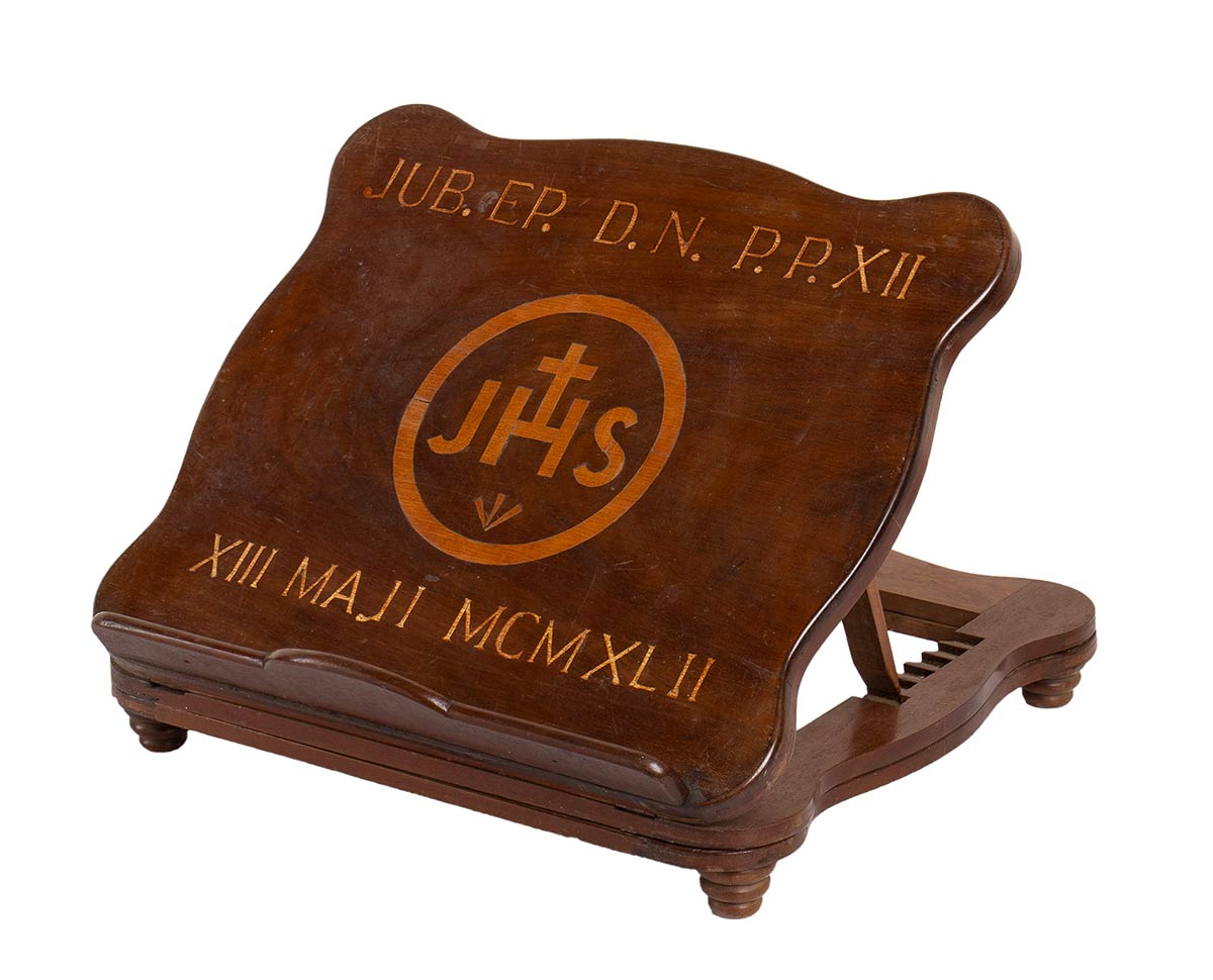 Leggio in legno, commemorativo del XXV Giubileo Episcopale di Papa PIO XII (venticinquennale della consacrazione episcopale del Santo Padre) usato da Sua Santità probabilmente durante le celebrazioni delle funzioni del giorno 13 Maggio 1942, data della commemorazione, oppure semplice regalo ricevuto per l'evento. Intarsi in legno d’abete per le scritte JUB.EP. D.N. P.P.XII con stemma JHS e data XIII MAJI MCMXLII. Allegata una foto di Papa PIO XII con S.E.Albini gerarca fascista. Misure del piano del leggio cm.37 x 33