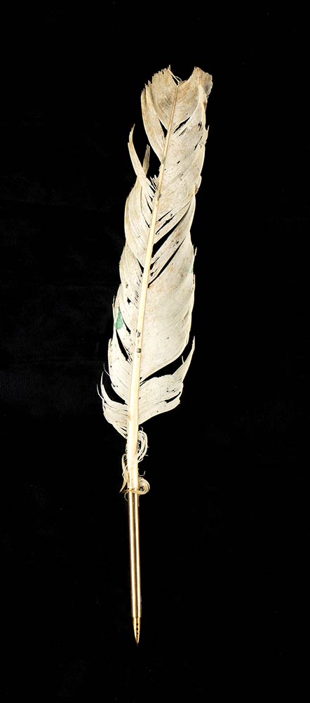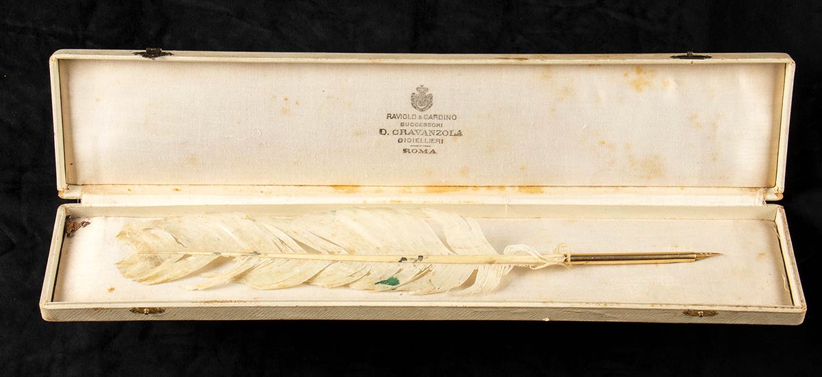 Penna stilografica con piuma d'oca bianca, probabile omaggio fatto all'allora arcivescovo Pacelli, futuro Papa Pio XII, per una qualche ricorrenza o anniversario. Conservata nella sua scatola orignale in legno e carta simil pelle bianca, interno in raso con il marchio del produttore "Raviolo & Gardino - Successori Cravanzola - Gioiellieri - Roma" . Impugnatura con pennino in oro 14K. Lunghezza della penna totale cm.37, del solo corpo in oro circa cm.10