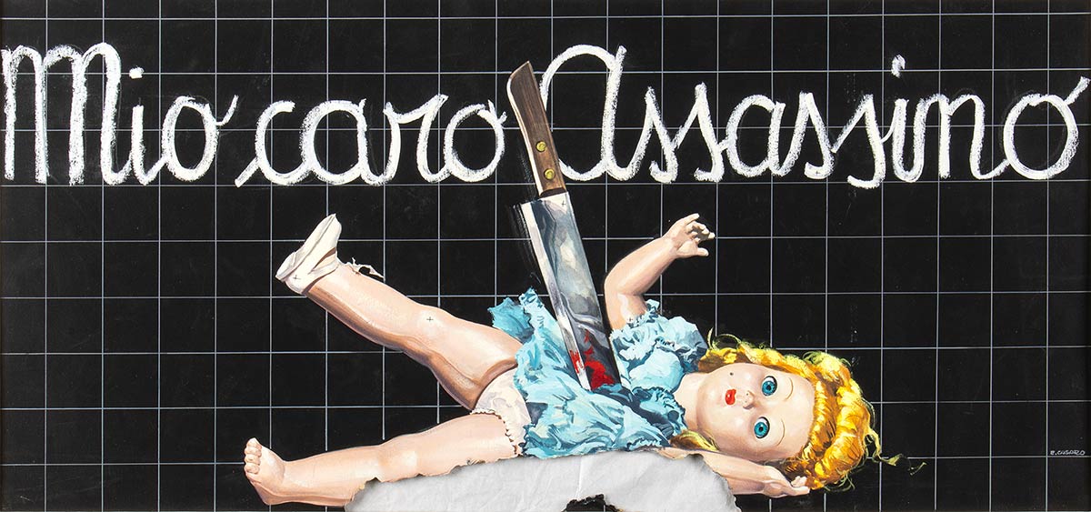 Bozzetto originale, dipinto, firmato Casaro sulla destra, per il film MIO CARO ASSASSINO thriller/horror (alla Dario Argento) del 1972. Olio su cartoncino, collage per le didascalie. Film per la regia di Tonino Valerii, attori George Hilton, Salvo Randone, William Berger, Marilù Tolo, musiche di Ennio Morricone.