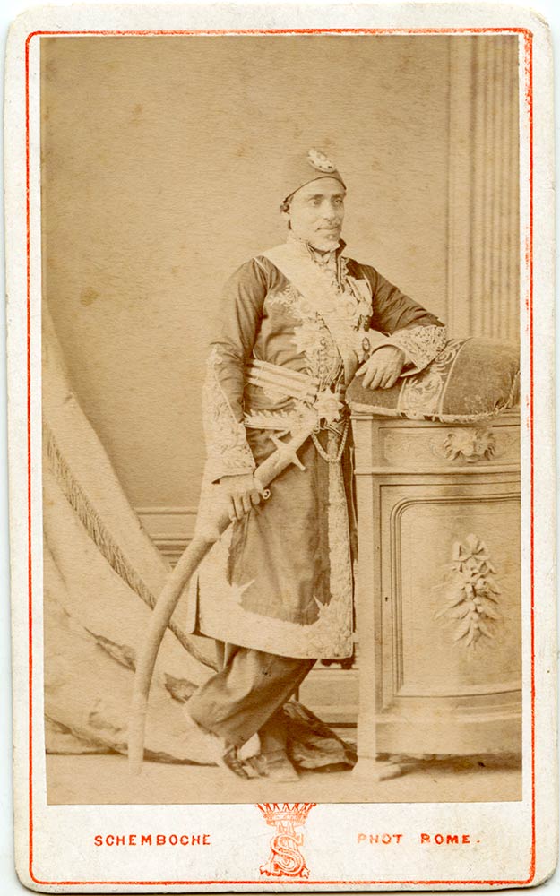 Cdv eseguito da Shemboche, famoso studio fotografico romano. Stampa all'albumina su cartonato con doppia intestazione a caratteri rossi. Dedica al retro da decifrare. Nella fotografia un uomo in alta uniforme con decorazioni del governatorato di Tunisi e imponente scimitarra in mano.