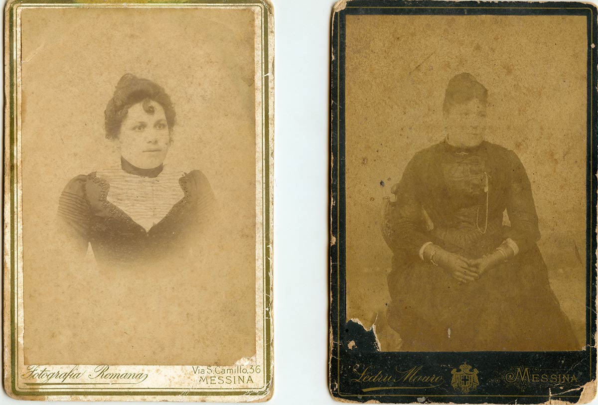Lotto di due albumine montate su cartonato “formato Margherita” con doppia intestazione per entrambe. Nelle foto due donne. Rare immagini del benessere che verrà messo in crisi dal terremoto del 1908