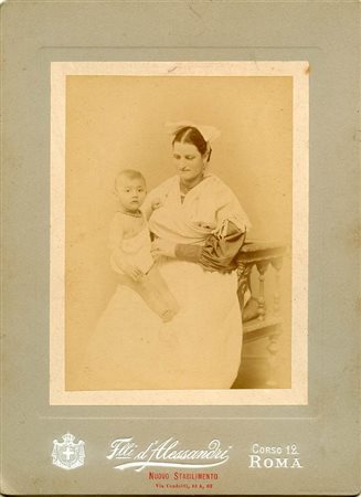 Albumina applicata a doppio cartonato di tipo Fradjer & Lojda. Raro logo dei Fratelli D'alessandri in cui si pubblicizza il “nuovo” stabilimento di via Condotti sul fronte. Nella foto madre con figlio indossano dei pesanti “grani” in corallo tipici nelle campagne a sud della capitale, in cui fino agli inizi del XX secolo indicavano l'appartenenza sociale. Dimensioni: 16,5 x 22,5