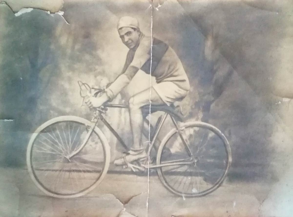 Ingrandimento su carta alla gelatina-bromuro. Nella foto un ciclista posa su una bicicletta da corsa tipo “giro-ruota”