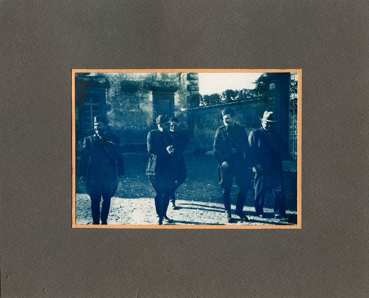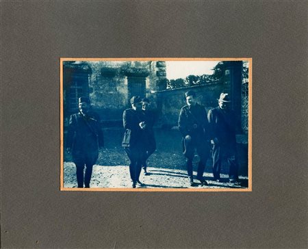 Cianotipia di altissima qualità applicata a doppio cartonato. Nella foto un gruppo di gerarchi non identificati in un cortile. Dimensioni: 23,5 x 19 Cm