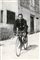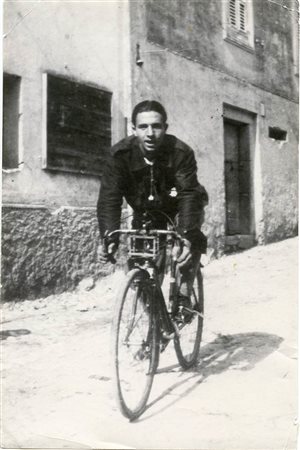 Ingrandimento da piccolo formato su carta alla gelatina-bromuro. Data al retro. Nella foto un giovane in divisa nera posa seduto su una bicicletta da corsa (Maino?). Dimensioni: 12 x 18 cm