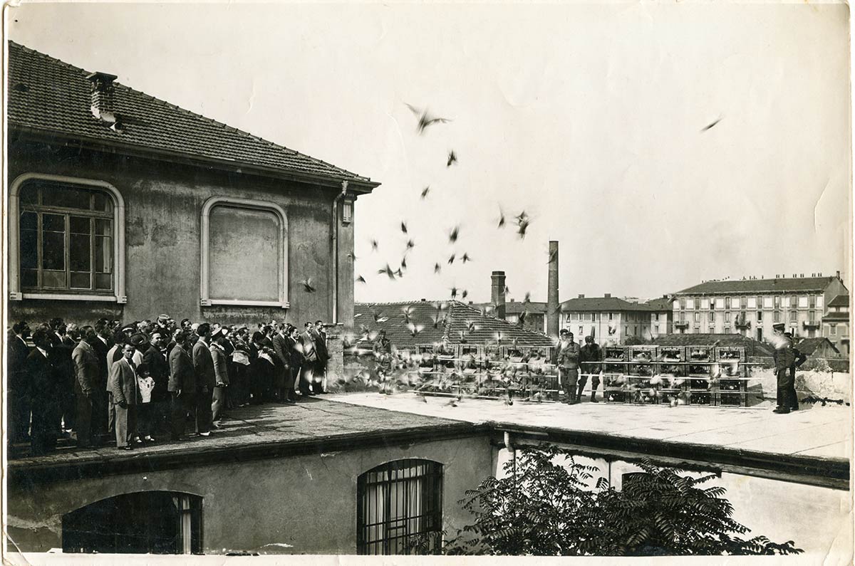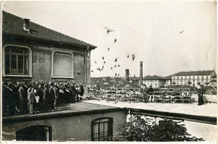 Stampa su celloidina al bromuro.Nella foto alcuni soldati e marinai aprono le gabbie dei piccioni viaggiatori di fronte ad una folla di persone. Dimensioni: 26 x 17 Cm